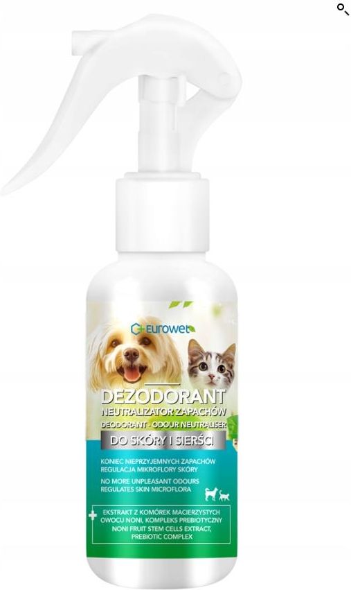 Eurowet Dezodorant neutralizator zapachów 100 ml KONIEC NIEPRZYJEMNYCH ZAPACHÓW REGULACJA MIKROFLORY SKÓRY + EKSTRAKT Z KOMÓREK MACIERZYSTYCH OWOCU NONI, KOMPLEKS PREBIOTYCZNY Spray zapewnia skuteczną ochronę przeciwko powstawaniu nieprzyjemnych zapachów na skórze i sierści zwierząt, wokół …