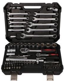 Rozbudowany zestaw kluczy EXTRALINK Powerlink EX.73677 do prac montażowych, serwisowych i mechanicznych. 82 precyzyjnie dobrane elementy umożliwiają realizację zróżnicowanych zadań bez potrzeby kompletowania dodatkowych akcesoriów. Zestaw sprawdza się w domu, garażu oraz podczas prac technicznych, zapewniając szybki dostęp do wszystkich komponentów w jednej walizce. W komplecie znajdują się nasadki metryczne w standardach 1/4" oraz 1/2", obejmujące popularne rozmiary do pracy z drobnymi i większymi połączeniami śrubowymi. Zestaw zawiera również końcówki Torx (T), imbus (HEX), bity płaskie (SL), krzyżowe (PH) i Pozidriv (PZ). Tak dobrany zakres umożliwia dopasowanie narzędzia do wielu typów śrub stosowanych w urządzeniach, konstrukcjach i pojazdach. W zestawie znajdują się dwie grzechotki (1/4" i 1/2") z mechanizmem zapadkowym oraz przełącznikiem kierunku pracy, co usprawnia dokręcanie i odkręcanie bez konieczności zdejmowania narzędzia. Przedłużki o różnych długościach, przeguby uniwersalne, adaptery oraz pokrętło typu T zwiększają kontrolę i umożliwiają pracę w trudno dostępnych miejscach. Komplet obejmuje 82 elementy: nasadki krótkie i wybrane długie w dwóch standardach napędu, bity SL, PH, PZ, HEX i Torx, dwie grzechotki, przedłużki, przeguby, adaptery do bitów oraz uchwyty pomocnicze. Taka konfiguracja wspiera montaż i demontaż podzespołów w instalacjach, sprzęcie domowym i motoryzacji, porządkując podstawowe narzędzia w jednym miejscu. Wytrzymała walizka typu blow case z tworzywa formowanego stabilizuje każdy element w dedykowanym gnieździe. Oznaczenia rozmiarów ułatwiają szybkie odnalezienie właściwej nasadki, a zatrzaskowe zamknięcia zabezpieczają zawartość podczas transportu. Kompaktowa konstrukcja ułatwia przechowywanie i pozwala utrzymać porządek w miejscu pracy.