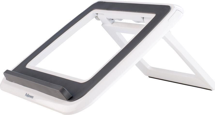 I-Spire Series Laptop Quick Lift - White Simple adjustment to seven angles Suit laptops with a limited angle of opening Foldout front legs to optimise screen positioning on any laptop up to 17” or 4.5kgs Soft touch front ledge holds the laptop in place Portable - folds flat to travel Recommended usage with an external keyboard and mouse Increases air circulation to keep your laptop cool Available in black and white Accredited against BS EN ISO 9241 by FIRA international, an independent Ergonomic Accreditor Specification: Angle Range: up to 100°