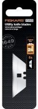 OSTRZA TRAPEZOWE CARBONMAX 5 SZT FS-1027229 CarbonMax ostrza wymienne do noża uniwersalnego, 5 szt. Fiskars Wymienne ostrza do noży Fiskars Pro CarbonMax™ przeznaczone do wszechstronnego cięcia. Tarcze CarbonMax™ wyposażone są w opatentowaną ochronę Fiskars, która pozostaje ostra 24 x dłużej niż zwyczajne noże. Ostrza zostały poddane badaniu laboratoryjnemu i przetestowane. Opakowanie zawiera 5 szt. ostrzy. Ostrza te pasują również do innych marek noży oprócz Fiskars.