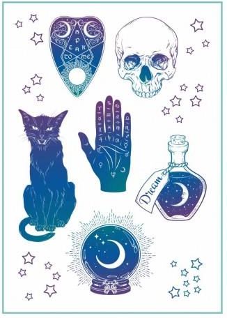 Tatuaże tymczasowe Boho flash magiczne wzory A4 Arkusz z tatuażami ma format kartki A4. Tymczasowe naklejki na ciało, które subtelnie nawiązują do magicznych rytuałów. Tatuaże zmywalne Boho Flash uzupełnią stylizację wiedźmy, czarodziejki i wróżbity. Będą hitem każdej przebieranej imprezy oraz eventów cosplay. Na arkuszu znajdują się wzory z efektem przejścia tonalnego, zawierające odcienie fioletu, granatu oraz koloru zielonego. Przed aplikacją tymczasowego tatuażu wykonaj próbę alergiczną na niewielkim fragmencie ciała. Zapoznaj się również z instrukcją, jak odpowiednio nałożyć tatuaż zmywalny. TATTOO.007