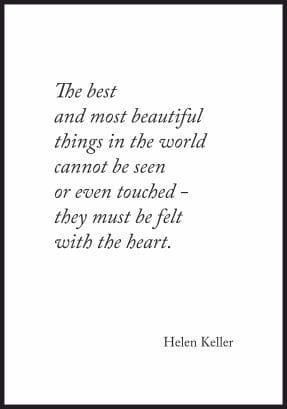 Przepiękna sentencja wypowiedziana przez Helen Keller, dotycząca tego, co w życiu najlepsze. W wolnym tłumaczeniu cytat oznacza "Najlepszych i najpiękniejszych rzeczy w życiu nie można zobaczyć ani dotkąć - można je tylko poczuć". Tekst na białym plakacie napisany jest delikatną, pochyloną, czarną …