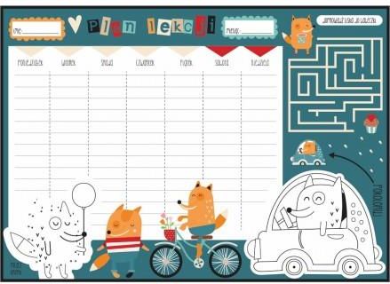 Kolorowy plan lekcji z kreatywnymi zadaniami dla ucznia z obrazkiem lisków. *PLAKAT NIESPODZIANKA - to dowolny plakat z naszej kolekcji, w dowolnym wymiarze, jednak nie większy niż zamówiony rozmiar. Plakat konfekcjonowany jest losowo, dlatego nazywa się niespodzianka. My również nie wiemy, jaki wzór do Ciebie trafi. Jednak każdy lubi niespodzianki, dlatego możemy śmiało stwierdzić, że to oczekiwanie sprawi niesamowitą radość.