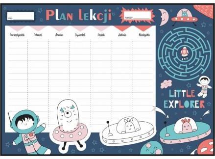 Kolorowy plan lekcji z kosmosem i zadaniami dla dziecka. *PLAKAT NIESPODZIANKA - to dowolny plakat z naszej kolekcji, w dowolnym wymiarze, jednak nie większy niż zamówiony rozmiar. Plakat konfekcjonowany jest losowo, dlatego nazywa się niespodzianka. My również nie wiemy, jaki wzór do Ciebie trafi. Jednak każdy lubi niespodzianki, dlatego możemy śmiało stwierdzić, że to oczekiwanie sprawi niesamowitą radość.