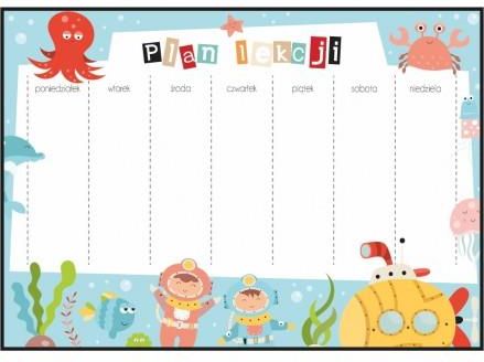 Duży plan lekcji z rozkładem zajęć na cały tydzień. Plan lekcji XXL z podwodnymi zwierzętami i nurkami. *PLAKAT NIESPODZIANKA - to dowolny plakat z naszej kolekcji, w dowolnym wymiarze, jednak nie większy niż zamówiony rozmiar. Plakat konfekcjonowany jest losowo, dlatego nazywa się niespodzianka. My również nie wiemy, jaki wzór do Ciebie trafi. Jednak każdy lubi niespodzianki, dlatego możemy śmiało stwierdzić, że to oczekiwanie sprawi niesamowitą radość.