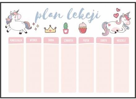 Kolorowy plan lekcji z jednorożcem dla dziewczynki, nadruk w odcieniach różu. Plan lekcji na 7 dni tygodnia. *PLAKAT NIESPODZIANKA - to dowolny plakat z naszej kolekcji, w dowolnym wymiarze, jednak nie większy niż zamówiony rozmiar. Plakat konfekcjonowany jest losowo, dlatego nazywa się niespodzianka. My również nie wiemy, jaki wzór do Ciebie trafi. Jednak każdy lubi niespodzianki, dlatego możemy śmiało stwierdzić, że to oczekiwanie sprawi niesamowitą radość.