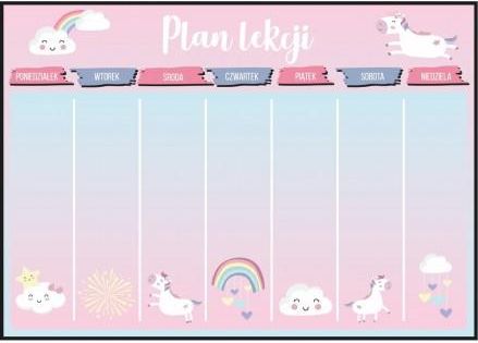Różowy, duży plan lekcji z tęczowymi jednorożcami. *PLAKAT NIESPODZIANKA - to dowolny plakat z naszej kolekcji, w dowolnym wymiarze, jednak nie większy niż zamówiony rozmiar. Plakat konfekcjonowany jest losowo, dlatego nazywa się niespodzianka. My również nie wiemy, jaki wzór do Ciebie trafi. …