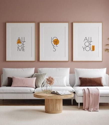 Zestaw graficznych plakatów z białym tłem i czarnymi napisami o miłości. Do plakatów nie są dołączone ramki.