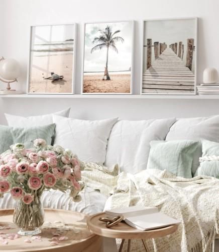 Galeria 3 wakacyjnych plakatów z widokiem na plażę i morze. Do plakatów nie są dołączone ramki.