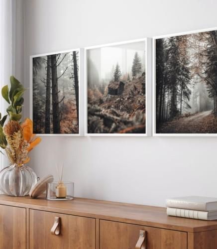 Galeria 3 plakatów w odcieniach szarości i brązu przedstawiający las chłodniejszą porą roku. Do plakatów nie są dołączone ramki.