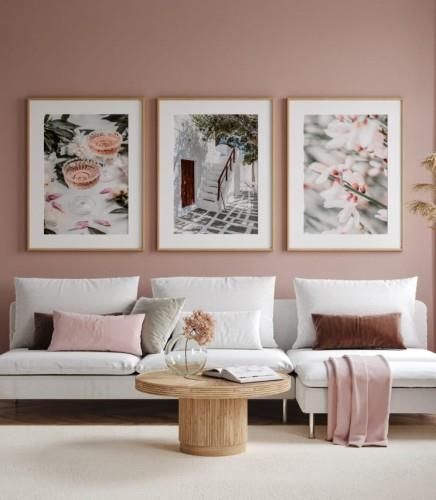 Kolekcja 3 delikatnych plakatów z dużą dozą bieli i subtelnego różu. Do plakatów nie są dołączone ramki.