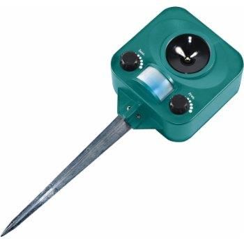 GREENMILL Odstraszacz ultradźwiękowy z sensorem ruchu (GR5108)Zalety ultradźwiękowego odstraszacza szkodników zasilanego bateryjnie: - Eliminuje - odstrasza szkodniki w humanitarny sposób bez użycia środków chemicznych. - Praktycznie niesłyszalny dla ludzi (większość wydawanych dźwięków to ultradźwięki, niesłyszane przez większość dorosłych ) . - Przystosowany do pracy na zewnątrz pomieszczeń ( w ogrodach i na polach ) przy dodatnich temperaturach. - Czujnik ruchu oparty na detekcji podczerwienie reaguje na ruch zwierząt. Oszczędny w zużyciu prądu : załącza ultradźwięki na okres 5 sekund oraz emituje światło z diody LED. - Płynna regulacja częstotliwości po zwala na wypłaszanie wybranych gatunków zwierząt ( ssaków ) . - Płynna regulacja czułości sensora ruchu. - Jaskrawa dioda LED sygnalizuje załączenie urządzenia i dodatkowo odstrasza zwierzęta światłem w nocy . - Odstraszasz czuwa 24 godziny na dobę! -Działanie sensor a w promieniu na wprost do: max. 6 - 7 metrów . - Zasięg działania sygnału odstraszającego w terenie: do max. 18m na wprost. - Szybka instalacja w gruncie dzięki załączonej szpilce. - Zasilanie przez 4 baterie AA (niezałączone) umożliwia instalację w terenie bez do stępu do sieci zasilającej . -Urządzenie nie zakłóca działania popularnych urządzeń domowych . Sposób działania i ograniczenia w użytkowaniu: Urządzenie przeznaczone jest do amatorskiego użytku indywidualnego w otwartym terenie bez dostępu publicznego. Odstrasza: dzikie psy , dzikie koty, sarny, jelenie, kuny, lisy, łasice, zające, wiewiórki, myszy, szczury i inne podobne dzikie szkodniki przebywające na powierzchni ziemi. Skuteczność urządzenia jest większa w stosunku do osobników młodych oraz nie udomowionych . UWAGA! Zwierzęta udomowione , dokarmiane i nie żerujące lub stale przebywające w terenach zurbanizowanych mogą nie reagować na ultradźwięki . Odstraszasz wyposażony jest w detektor ruchu oparty na podczerwieni. Z chwilą wykrycia ruchu urządzenie emituje krótkotrwałe ultradźwięki z zakresu 15 - 50kHz. Zwierzęta , w tym ssaki , są wyczulone na ten zakres częstotliwości dźwięku i dlatego przenoszą się poza zasięg irytującego hałasu , który wywołuje u nich poczucie zagrożenia i utrudnia żerowanie . Urządzenie zasilane jest za pomocą czterech wymiennych baterii typu AA.