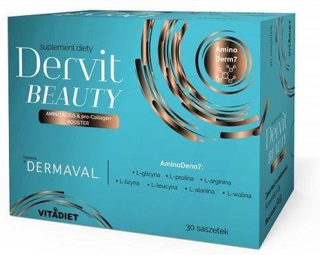 Suplement diety Dervit Beauty 30 saszetek zawiera składniki, które pomagają wspierać nasz naturalny cykl wytwarzania kolagenu. UWAGA Termin przydatności produktu Dervit Beauty - produkt najlepiej zużyć przed końcem 02.2026 PRODUKT ODPOWIEDNI DLA WEGAN I WEGETARIAN Pielęgnacja przeciwstarzeniowa od wewnątrz1 2 Skóra składa się głównie z kolagenu i elastyny, dzięki którym zachowuje gęstość, jędrność i elastyczność. Aminokwasy stanowią budulec tych białek. Niestety, po 25 roku życia rozpoczyna się fizjologiczny proces starzenia się związany ze spadkiem ilości kolagenu w skórze. Proces ten potęgują czynniki zewnętrzne i wewnętrzne, na które jesteśmy narażeni przez całe życie. Działanie anti-aging, takie jak zrównoważona dieta, zabiegi pielęgnacyjne, warto wdrożyć już po 25 roku życia. Produkt Dervit Beauty, wzbogacony o przebadaną klinicznie mieszankę DERMAVAL™, kwas hialuronowy, uzupełnia dietę o składniki niezbędne do procesu syntezy kolagenu: witaminę C oraz aminokwasy będące budulcem kolagenu. 1 Witamina C pomaga w prawidłowej produkcji kolagenu w celu zapewnienia prawidłowego funkcjonowania skóry oraz przyczynia się do ochrony składników komórkowych przed uszkodzeniem oksydacyjnym. DERMAVAL™ to bogaty w przeciwutleniacze kompleks składający się z dziewięciu ekstraktów roślinnych i koncentratów: owoce granatu, pędy szparagów, owoce piżmianu jadalnego, owoce kawy arabiki, kwiaty perełkowca japońskiego owoce aceroli, jagody Camu Camu, jagody Acai, owoce mangostanu właściwego które pomagają wspierać nasz naturalny cykl wytwarzania kolagenu. 3 4 Wyniki badań klinicznych pokazują, że pojedyncza dawka 50 mg DERMAVALu znacząco zmniejsza poziom enzymów elastazy i kolagenazy (dwóch enzymów prozapalnych, mających wpływ na degradację kolagenu) w surowicy, mimo że została podana na krótko przed spożyciem 75 g glukozy. AminoDerm7 - kompleks 7 aminokwasów, w tym 3 kluczowych dla budowy skóry oraz włosów. L-glicyna, L-prolina, L-lizyna pobudzają fibroblasty do produkcji kolagenu, L-leucyna wraz z kwasem hialuronowym zapewniają optymalne nawilżenie skóry. Składniki Dervit Beauty. Suplement diety. Zawiera substancję słodzącą. Zawiera kofeinę; nie zaleca się stosowania u dzieci i kobiet w ciąży (zawartość kofeiny w zalecanej dziennej porcji: max. 0,045 mg). Składniki: Amino Derm7 (L-glicyna, L-prolina, L-arginina, chlorowodorek L-lizyny, L-leucyna, L-alanina, L-walina), regulator kwasowości - kwas cytrynowy, koncentrat soku z owoców aceroli w proszku (Malpighia glabra L.) (standaryzowany na 34% witaminy C), odwodniony koncentrat soku buraka czerwonego (Beta vulgaris), aromat wieloowocowy, mieszanka ziołowo-owocowa Dermaval™ * [ekstrakt z owoców granatu (Punica granatum L.), koncentrat z pędów szparagu w proszku (Asparagus officinalis L.), koncentrat z owoców piżmianu jadalnego w proszku (Abelmoschus esculentus), ekstrakt z nasion kawyarabskiej (Coffea arabica), kwercetyna – ekstrakt z kwiatów perełkowca japońskiego (Sophora japonica L.), koncentrat soku owoców aceroli w proszku (Malpighia glabra L.), koncentrat soku z owoców jagód Camu Camu (Myrciaria dubia), maltodekstryna, koncentrat z owoców jagód Acai (Euterpe oleracea mart), koncentrat z owoców mangostanu właściwego (Garcinia mangostana)], kwas hialuronowy, przeciwutleniacz - kwas askorbinowy, substancja słodząca - sukraloza. Zalecana porcja do spożycia w ciągu dnia niezbędna do uzyskania korzystnego działania: 1 saszetka. Sposób użycia: Do 100 ml (pół szklanki) chłodnej lub ciepłej (niewrzącej) wody wsypać zawartość 1 saszetki i wymieszać. Wypić bezpośrednio po przygotowaniu. Ostrzeżenia: Nie stosować u osób mających predyspozycje do tworzenia kamieni nerkowych lub chorujących na kamicę nerkową. Zawiera kofeinę; nie zaleca się stosowania u dzieci i kobiet w ciąży. Nie spożywać z innymi produktami będącymi źródłem kofeiny lub innych składników o podobnym działaniu. Produkt nie jest przeznaczony dla dzieci, kobiet w ciąży, karmiących piersią oraz osób z indywidualnym brakiem tolerancji na którykolwiek ze składników produktu. Suplement diety nie może być stosowany jako zamiennik zróżnicowanej diety. Zróżnicowany sposób żywienia i zdrowy tryb życia są istotne dla utrzymania prawidłowego stanu zdrowia. Nie należy przekraczać zalecanej porcji do spożycia w ciągu dnia. * Znak towarowy Dermaval ™ jest własnością VDF FutureCeuticals 1Oświadczenia EFSA 2Monika Morąg, Agnieszka Burza, Budowa, właściwości i funkcje kolagenu oraz elastyny w skórze, Journal of Health Study and Medicine, 2017, nr 2, 77-100 Anna Nowicka-Zuchowska, Aleksander Zuchowski, Kolagen – rola w organizmie i skutki niedoboru, Lek w Polsce, VOL 29 NR 11/12’19 (342/343) 3 Reyes-Izquierdo T, Nemzer B, Argumedo R, Shu C, Pietrzkowski Z, Dermaval™ inhibits glucose-induced neutrophil elastase activity in healthy subjects, Nutrition and Dietary Supplements 2014:6 4 https://www.futureceuticals.com/dermaval