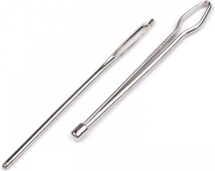 Zestaw zawiera dwie igły, jedna o długości 65 mm a druga o długości 68 mm. Ułatwiają one nawlekanie sznurka, gumki do tunelika, niezbędne przy pleceniu rękodzieła. Jedna z igieł na całej długości ma szczelinę do wsunięcia i zablokowania przeciąganej tasiemki. Towar dostępny w sprzedaży hurtowej i detalicznej.