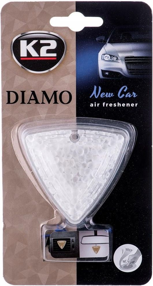 K2 DIAMO zapach samochodowy NOWY SAMOCHÓD new car Za odpowiednią jakością i wytrzymałością tego produktu stoi znany producent K2 gwarantujący jakość swoich produktów. K2 DIAMO NOWY SAMOCHÓD/new car 25g (V88NCA) Zapach samochodowy 2w1 w formie zawieszki lub w kratkę nawiewu Ekscytujący i elegancki aromat odświeżacza K2 Diamo wyrwie Cię z szarości dnia i rzuci w objęcia pulsującego neonami miasta nocą. Szyk i luksus królewskiego aromatu gwarantuje maksymalny komfort i przyjemność z jazdy. Odświeżacz K2 Diamo, zdobi wnętrze auta niczym stylowy zegarek.Nadaje prestiżowy wygląd i podkreśla charakter. Po zamontowaniu odświeżacza w kratce nawiewu, szlachetny aromat uwalnia się, długotrwale i przyjemnie pobudzając zmysły. Nietuzinkowa woń zamknięta jest w polimerowych granulkach umieszczonych w stylowej obudowie. Solidny klips pozwala trwale zamontować odświeżacz i eliminuje ryzyku wypięcia się. Gramatura [l] - 25 g Nuta zapachowa - nowy samochód / NEW CAR Zapachy wg zastosowania - na lusterko lub do kratki nawiewu 2w1 Zapachy wg typu - diament z pachnącymi granulkami K2|V88NCA