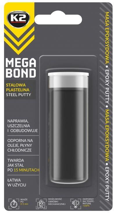 K2 MEGA BOND STALOWA PLASTELINA NAPRAWCZA 40g Stalowa plastelina naprawcza K2 Mega Bond Stalowa plastelina naprawcza K2 Mega Bond to profesjonalna, szybkowiążąca plastyczna masa epoksydowa o szerokiej gamie zastosowań. Niezastąpiona w motoryzacji, przemyśle i domu. Wiąże materiały takie jak stal, żeliwo, aluminium, miedź, mosiądz, drewno, beton, ceramika itp. Idealna do stosowania jako plastelina do uszczelniania zbiorników i rur. Odporna na oleje, płyny chłodnicze, kwasy. Szybko zatrzymuje wycieki, nadaje się do napraw rur, zbiorników, beczek, kanistrów itp., a także do wypełniania dziur, pęknięć i ubytków w obudowach oraz odlewach. Zakleisz nią niepożądane otwory i dziury, a nawet wyrównasz powierzchnię. Masa naprawcza do metaluK2 Mega Bond może być szlifowana, wiercona, gwintowana, malowana. Stalowa plastelina zaczyna wiązać już po 3-5 minutach, utwardza się po 15 minutach, pełną wytrzymałość osiąga po 24h. Prosta w użyciu. Łatwo się ugniata i daje się formować. Pozwala uzyskać dowolny kształt wypełnienia, który po utwardzeniu można oszlifować i pomalować. Opakowanie : blister 40g Gama zastosowań plasteliny epoksydowej K2 Mega Bond: uszczelnianie rur stalowych i miedzianych z wodą i innymi płynami naprawa cieknących grzejników naprawa wycieków w rurociągach naprawa zbiorników stalowych, żeliwnych i aluminiowych naprawa wad odlewniczych naprawa pęknięć w silnikach, korpusach i obudowach naprawa pęknięć w miskach olejowych naprawa wybitych gniazd łożyskowych naprawa ubytków kawitacyjnych regeneracja skorodowanych powierzchni regeneracja wyrobionych gwintów wypełnianie ubytków np. w wyszczerbionych płytkach Właściwości : odporność na temperaturę +150 C możliwość szlifowania wiercenia gwintowania malowania odporna na oleje, płyny, kwasy idealna do wypełniania ubytków przyczepność do wielu tworzyw z wyjątkiem wykonanych z polietylenu PE i polipropylen Sposób użycia: Należy oczyścić i odtłuścić naprawianą powierzchnię Odciąć odpowiednią ilość Ugniatać do jednolitej masy przez 1-2 minuty Nałożyć na naprawianą powierzchnię Optymalna temp. utwardzenia 20°C