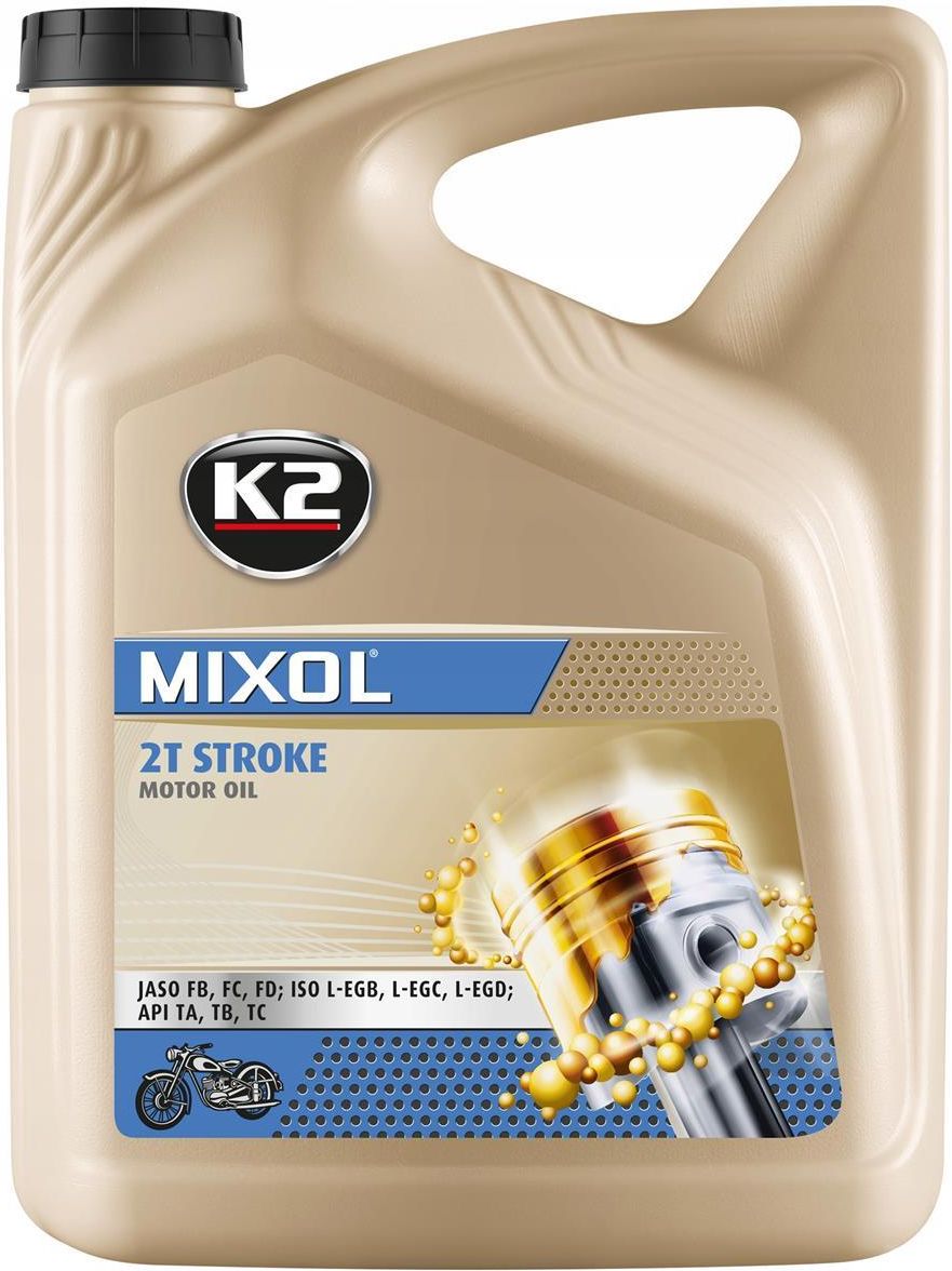 K2 - MIXOL - 2T STROKE - 5L Olej do sporządzania mieszanki w silnikach dwusuwowych, chłodzonych powietrzem i wodą, chroni silnik przed zużyciem, ogranicza powstawanie nagarów i osadów. Dodatki smarne i antykorozyjne dobrane w optymalnych proporcjach ograniczają dymienie. Po wymieszaniu tworzy jednorodną mieszaninę, która ułatwia rozruch w każdych warunkach. Idealne rozwiązanie dla posiadaczy kultowych motocykli z czasów PRL. Sposób użycia: Przygotować mieszankę zgodnie z zaleceniami producenta silnika, zwykle jest to 1:50. Zalety doskonała mieszalność doskonałe smarowanie redukuje dymienie ogranicza powstawanie nagarów i osadów WŁAŚCIWOŚCI I SPECYFIKACJE TYP SILNIKA: 2 SUWOWY JASO FB, FC, FD ISO L-EGB, L-EGC, L-EGD API TA, TB, TC