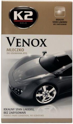 Mleczko do usuwania rysK2 VENOXIDEALNY STAN LAKIERU BEZ ZARYSOWAŃGładki i błyszczący lakier bez zarysowań cieszy oko i przyciąga wzrok. Sprawia, że samochód prezentuje się wyjątkowo na tle innych aut. Niestety promienie słoneczne załamują się na nierównościach lakieru i uwydatniają wszelkie defekty, szczególnie w jasne dni. Dlatego stworzyliśmy mleczko Venox, aby dzięki jego innowacyjnej formule przywrócić lakierowi pierwotny blask. Venox usuwa rysy trwale, zamiast tymczasowo je maskować. Nawet po wielokrotnym myciu auta zarysowania się nie pojawią. Przekonaj się, jak łatwo dzięki mleczku K2 Venox przywrócić idealny wygląd lakieru.SPOSÓB UŻYCIA: Przed nałożeniem umyć i oczyścić dokładnie lakier. Nanieść K2 Venox przy pomocy gąbki. Polerować aż do momentu całkowitego usunięcia defektów. Wytrzeć resztki mleczka przy pomocy mikrowłókna lub czystej bawełnianej ściereczki.WSKAZÓWKA:Dzieła renowacji lakieru dopełnisz stosując inne produkty Gold. W celu błyskawicznego nabłyszczenia lakieru, zastosuj wosk w płynie Spectrum. Natomiast dla uzyskania długotrwałej ochrony połączonej z diamentowym połyskiem użyj wosku ochronnego Quantum.ZESTAW ZAWIERA:K2 Venox, GąbkaStan: Nowy