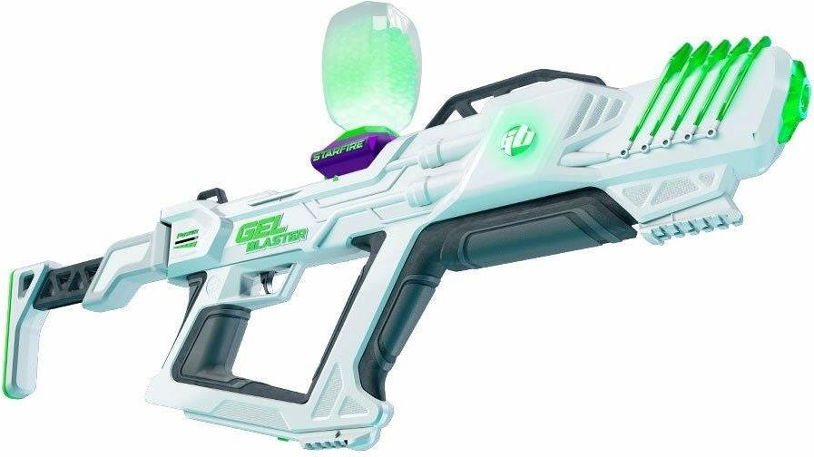 Gel Blaster Surge XL Day'n'Nite Edition Oryginalny Gel Blaster WŁADAJ NOCĄ Surge XL Day'n'Nite Edition to kolejna generacja blasterów od zespołu Gel Blaster. Nasz najnowszy dodatek jest najpotężniejszym blasterem w naszej ofercie! Jest wyposażony w regulator prędkości, który dostosowuje moc blastera od 52 do zdumiewających 76 metrów na sekundę. Co najważniejsze, edycja Day'n'Nite jest wyposażona w nasz nowy aktywator Starfire. Aktywator wykorzystuje technologię oświetlenia UV do doładowania kulek Gellets Starfire, aby świeciły w ciemności i tworzyły świecący efekt, który trzeba zobaczyć, aby uwierzyć. Surge wykorzystuje Gellets® na bazie wody. Można go wielokrotnie ładować, nie brudzi, jest nietoksyczny i bezpieczny dla dzieci! Półautomatyczne i w pełni automatyczne tryby pracy blastera W zestawie 10000 kulek wodnych Gellets® oraz 5000 Starfire Gellets® święcących w ciemności Gellets® rozpadają się po uderzeniu i wyparowują na podwórku, co oznacza brak żmudnego sprzątania! Do 4 godzin zabawy na jednym ładowaniu przez USB-C Pełna adrenaliny rywalizacja nie musi być bałaganiarska. W tym miejscu z pomocą przychodzi Gel Blaster. Nasze Blastery i Gellets® oznaczają, że możesz toczyć epickie bitwy w pomieszczeniach, na świeżym powietrzu lub gdziekolwiek indziej, prawie bez bałaganu i sprzątania! Zalecane dla osób w wieku od 14 do 99 lat. Gel Blaster, Go Play! STWÓRZ WŁASNĄ AMUNICJĘ ZA POMOCĄ NASZYCH GELLETS Gellets® pękają przy uderzeniu i natychmiast zaczynają się rozpadać.Spędzaj mniej czasu na sprzątaniu, a więcej na zabawie! Jak one działają? Zanurz Gellets® w wodzie na zaledwie 2 godziny i obserwuj, jak granulki żelu zamieniają się w Gellets®. JAK JE CZUJESZ? Zapewniają wystarczające wrażenie ukłucia, aby było ekscytujące!To jak szybkie, drobne ukłucie gumową opaską. Prawdopodobnie nawet tego nie odczujesz, ponieważ będziesz zbyt zajęty zabawą. Zarządzanie baterią Surge ma wbudowaną baterię, która zapewnia 4 godziny gry na 45-minutowym ładowaniu przez USB-C i jest wyposażona we wskaźnik niskiego poziomu naładowania, który sygnalizuje, kiedy należy ją naładować. Wyjątkowa moc i zasięg Surge może pochwalić się niesamowitym zasięgiem ponad 30 metrów na jeden strzał i może wypuszczać Gellets® z prędkością do 76 m/s. Możesz łatwo zmniejszyć prędkość wystrzału do 36 m/s używając. Różne tryby pracy Surge ma regulowane tryby, takie jak tryb pojedynczego strzału dla precyzji i treningu, tryb serii po 3 strzały oraz tryb w pełni automatyczny, który pomoże zdominować konkurencję dzięki sile ognia 12 Gellets® na sekundę. Zawartośc zestawu Surge XL Day 'n' Nite jest wyposażony w wyjmowany magazynek, zbiornik XL, aktywator Starfire, 5000 żelków Starfire, 10000 żelków dziennych, szybką ładowarkę USB-C i okulary ochronne. Kup już dziś i poznaj moc Surge XL. Specyfikacja Zawartość zestawu: 1x Surge XL D'n'N Blaster , 1x opakowanie 10 000 Gellets do nawodnienia , 1x opakowanie 5 000 Starfire Gellets do nawodnienia , 1x Starfire Activator , 1x pojemnik z 800 Gellets gotowymi do gry , 1x okulary ochronne , 1x przewód USB-C , 1x pasek na ramię Tryby pracy: 1 strzał , seria 3 strzałów , pełen automat Wymiary: 57 x 30 x 10,5 cm Ostrzeżenie: produkt przeznaczony dla osób w wieku 14+ lat