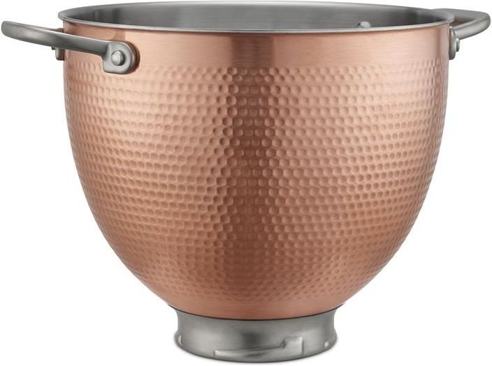Ozdobna dzieża KitchenAid Artisan 5 5KSM5SSBCB miedź młotkowana Traktujemy jedzenie poważnie 1919 - Narodziny Legendy Niemal sto lat temu Herbert Johnson, inżynier z Ohio, wymyślił kolejne cudowne urządzenie, które miało zrewolucjonizować życie mistrzów kuchni i smakoszy, pierwszy elektryczny mikser dla gospodarstw domowych. Podczas testowania wynalazku, żona jednego z prezesów firmy, nieświadomie wymyśliła nazwę marki, mówiąc: „Bez względu na to, jak to nazwiecie, to najlepsza pomoc kuchenna (ang. „kitchen aid”), jaką miałam”. Tak narodziło się KitchenAid. Przez kolejne lata, inspirując się pracą zawodowych szefów kuchni, marka stale opracowywała innowacyjne rozwiązania i ulepszała je specjalnie dla smakoszy i kucharzy. Wszystkie urządzenia KitchenAid charakteryzują się doskonałym wykonaniem, wytrzymałością, wyrafinowanymi materiałami, solidną budową i najwyższą dbałością o szczegóły. Patrząc na stal nierdzewną i dotykając jej, mamy poczucie wytrzymałości i niezrównanej jakości. Wszystkie te elementy są w harmonijny sposób połączone z niezwykle staranną stylistyką, szczegółowością i uwagą zarówno w dużych, jak i małych urządzeniach. Miedziana misa Miedziana misa do miksera to element nie tylko funkcjonalny, ale i ozdobny, który z czasem zyskuje unikalny charakter. Dzięki naturalnemu wykończeniu, powierzchnia miedzi zmienia się, pokrywając patyną, co nadaje jej głębi i niepowtarzalnego uroku. Regularne polerowanie pozwala zachować oryginalny połysk, lecz naturalne zmiany również mają swój urok, wpisując się w estetykę retro i dodając wnętrzu nieco nostalgii. Choć dzieża wymaga specjalnej pielęgnacji, jak mycie ręczne i osuszanie miękką ściereczką, to starzenie się miedzi sprawia, że każdy egzemplarz staje się jedyny w swoim rodzaju.