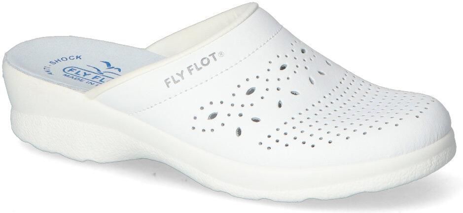 Wygodne klapki firmy Fly Flot:- cholewka została wykonana z najlepszej jakości skóry naturalnej licowej - wnętrze pokryte zostało skórą naturalną - wkładka wewnętrzna wykonana ze skóry naturalnej aby zapewnić komfort podczas użytkowania - podeszwa o grubości 3,5 cm zapewnia odpowiednią stabilizację - biały kolor oraz modny fason tworzą idealne połączenie!