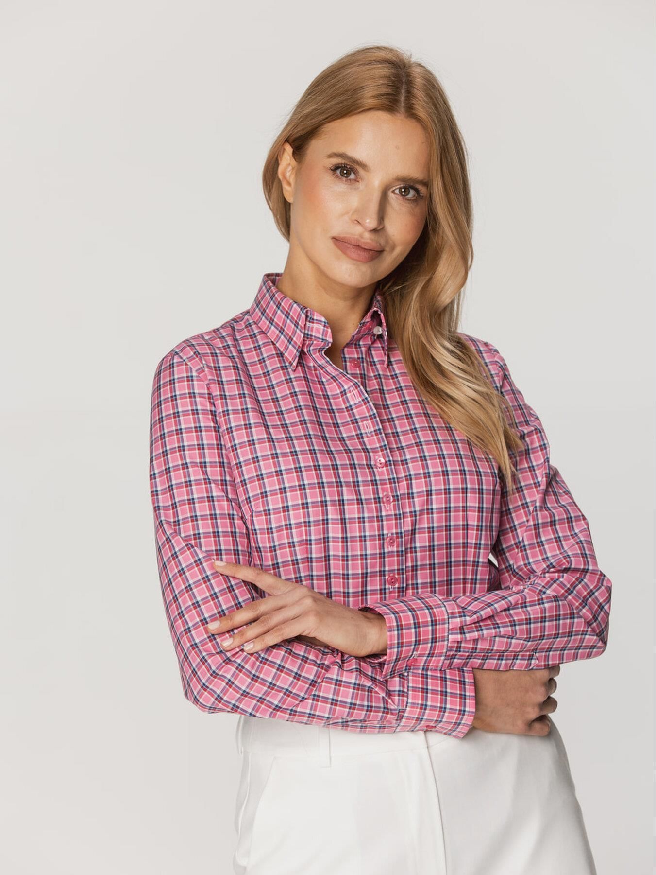 Różowa, taliowana koszula damska w granatową i czerwoną kratkę z klasycznym kołnierzykiem, 100% bawełny