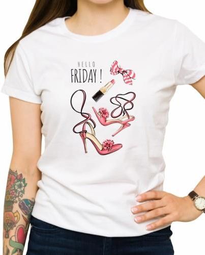 T-shirt dla prawdziwej imprezowiczki. Koszulka dla koleżanki, kumpeli, przyjaciółki, z napisem "witaj piątku". Wielkość nadruku na koszulce "Hello friday" Szerokość nadruku na koszulkach różni się w zależności od rozmiaru T-shirtu i wynosi odpowiednio: przy rozmiarze S - 20 cm przy rozmiarze M - 23 cm przy rozmiarze L, XL, XXL - 26 cm. Wysokość wzoru jest dobierana proporcjonalnie, jednak nigdy nie przekracza 38 cm. W przypadku dłuższych grafik szerokość nadruku wynika z proporcji przy zachowaniu długości 38 cm. Przed złożeniem zamówienia zajrzyj do zakładki "Rozmiary koszulek".