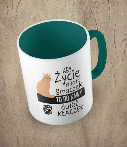 Kubek z nadrukiem dla kociarza - z zabawnym tekstem "aby życie miało smaczek to do kawy dołóż kłaczek".