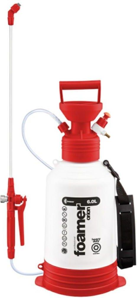 Pianownica z przyłączem do kompresora Orion Super Air HD Acid line Kod produktu: WTI.2237 Pojemność (l): 6 Ciśnienie (bar): 3,5 Pianownica z przyłączem do kompresora umożliwia szybkie i wygodne uzupełnianie ciśnienia bez konieczności ręcznego pompowania. Przyłącze kompresorowe to element, który umożliwia podłączenie zewnętrznego źródła sprężonego powietrza (kompresora) do układu pianownicy. KORZYŚCI Brak konieczności pompowania ręcznego – użytkownik nie musi ręcznie pompować ciśnienia, co znacząco zmniejsza wysiłek i zwiększa komfort pracy. Drobniejsza mgiełka – możliwe jest uzyskanie lepszego rozpylania, co poprawia skuteczność pokrycia powierzchni. Możliwość oprysku na dużą skalę Cechy lanca z włókna szklanego – długość 50cm wygodny lejek – wygodne wlewanie płynów zawór bezpieczeństwa – kontrola ciśnienia pasek poziomu cieczy – łatwe dozowanie i kontrolowanie poziomu płynu wygodny pas nośny – komfort użytkowania podczas długotrwałej pracy pierścień stabilizujący – stabilizacja i ochrona zbiornika przed uszkodzeniem