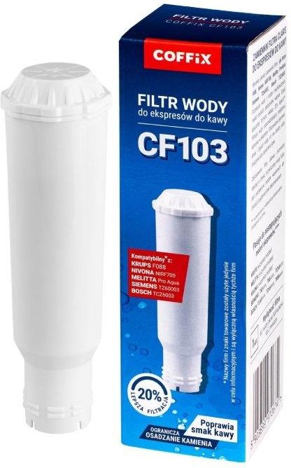 Filtr do ekspresu Melitta Nivona Krups Siemens Bosch (zamiennik) Wydajny do 60L – COFFIX CF103 Wysokiej jakości zamiennik filtra – jak Krups F088, Nivona NIRF700/701, Melitta ProAqua, Siemens TZ60003, Bosch TCZ6003 Oczyszcza wodę z drobin mechanicznych, metali ciężkich, pestycydów, wapnia Dzięki specjalnej formule wkładu o 20% lepiej** filtruje wodę przeciwdziałając osadzaniu się kamienia w ekspresie! Odczuwalnie poprawia smak i zapach wody, co ma bardzo duże znaczenie przy zaparzaniu kawy Zastosowanie filtra ułatwia otrzymanie idealnej w smaku, oczyszczonej wody, która jest pozbawiona osadów wapiennych, aby chronić urządzenie przed zakamienieniem Pasuje do następujących modeli ekspresów*: Melitta wszystkie modele: Barista TS Smart, Latte Select, CI Touch, CI E970-003, Passione OT, Latticia OT, Avanza PLUS, Solo, Barista T Smart, Barista T Krups wszystkie modele: EVIDENCE EA89.., EA894T, EA8908, EA8901, EA8908 EA9010, EA8010, EA8441, EA8165, EA8050, EA829E, EA8080, EA816B, EA8105, EA815E, EA693E, EA8298, EA 850B, EA 829D, EA8808, EA8432, EA8160, EA 850B, EA 829D, EA810B, EA850B, EA8108, EA8107, EA8150, EA8161, EA826E, EA8250, EA829D, EA8005, EA829E, XN410T, XP5210, XP7200, XP7240, XP5000, XP5050, XP5080, XP4000, XP4020, XP4050, XP 4070, XP2000, XP2020, XP2050, F889, F890, F891, F892, EA8000, EA8025, EA8200, EA8220, EA8240, EA8245, EA8255, EA8260, EA7020, EA6990, EA6935, EA6930, EA6910, EA8015, EA8017, EA8019, EA801B, EA802B, EA8038, EA8251, EA8258, EA8271, EA8278, EA827E, EA8280, EA828E, EA8320, EA8321, EA8322, EA8340, EA8421, EA8422, EA8442, EA8448, EA8908, EA894T, EA891810, 895 Evidence One, EA9000, EA900H,EA98, XP5000, XP5050, XP5220, XP5240, XP5250, XP4030, XP2010, XP2070, XP2280, F920, F921, F922, F927 oraz WSZYSTKIE ekspresy marki Krups, w których montuje się filtr wody. Nivona Cafe Romatica: 520, 650, 610, 620, 626, 630, 635, 646, 680, 710, 720, 725, 730, 740, 745, 750, 757, 759, 765, 767, 770, 777, 830, 831, 840, 841, 845, 850, 855 Siemens Surpresso: Compact TK52002, S20-TK60001, S40-TK64001, S45-TK64F09, S60-TK68001, S65-TK68009, S70-TK69001, S75-TK69009, TK58001 Bosch: B20-TCA6001, B30-TCA6301, B65-TCA6709, B7 – TCA6801, B20 – TCA 6001, B30 – TCA 6301, B40 – TCA 6401, B60 – TCA 6701, B65 – TCA 6709, TCA5309, TCA5601, TCA6701, TCA5608, TCA5609, TCA6401, TCA6709 Wydajność filtra 60 litrów wody (około 500 kubków kawy) lub 2 miesiące od pierwszego kontaktu filtra z wodą Montaż filtra w ekspresie: Napełnij filtr wodą. Zamontuj wypełniony wodą filtr w zbiorniku zgodnie z instrukcją obsługi ekspresu. Aktywuj filtr zgodnie z instrukcją obsługi lub dwukrotnie przygotuj gorącą wodę w ekspresie. Ekspres gotowy do użytku. Skład: Najlepszej jakości węgiel aktywny z łupin orzechów kokosowych, żywica jonowymienna niezawierająca sodu. Powyższy skład redukuje kamień i metale ciężkie takie jak miedź, ołów, skutecznie usuwa chlor oraz nieprzyjemny zapach, poprawia smak wody i kawy. *SZCZEGÓŁOWE INFORMACJE NA STRONIE PRODUCENTA **W PORÓWNANIU Z WIĘKSZOŚCIĄ ZAMIENNIKÓW DOSTĘPNYCH NA RYNKU ***NAZWY I ZNAKI TOWAROWE ZOSTAŁY UŻYTE JEDYNIE W CELACH INFORMACYJNYCH I SĄ WYŁĄCZNĄ WŁASNOŚCIĄ TYCHŻE FIRM