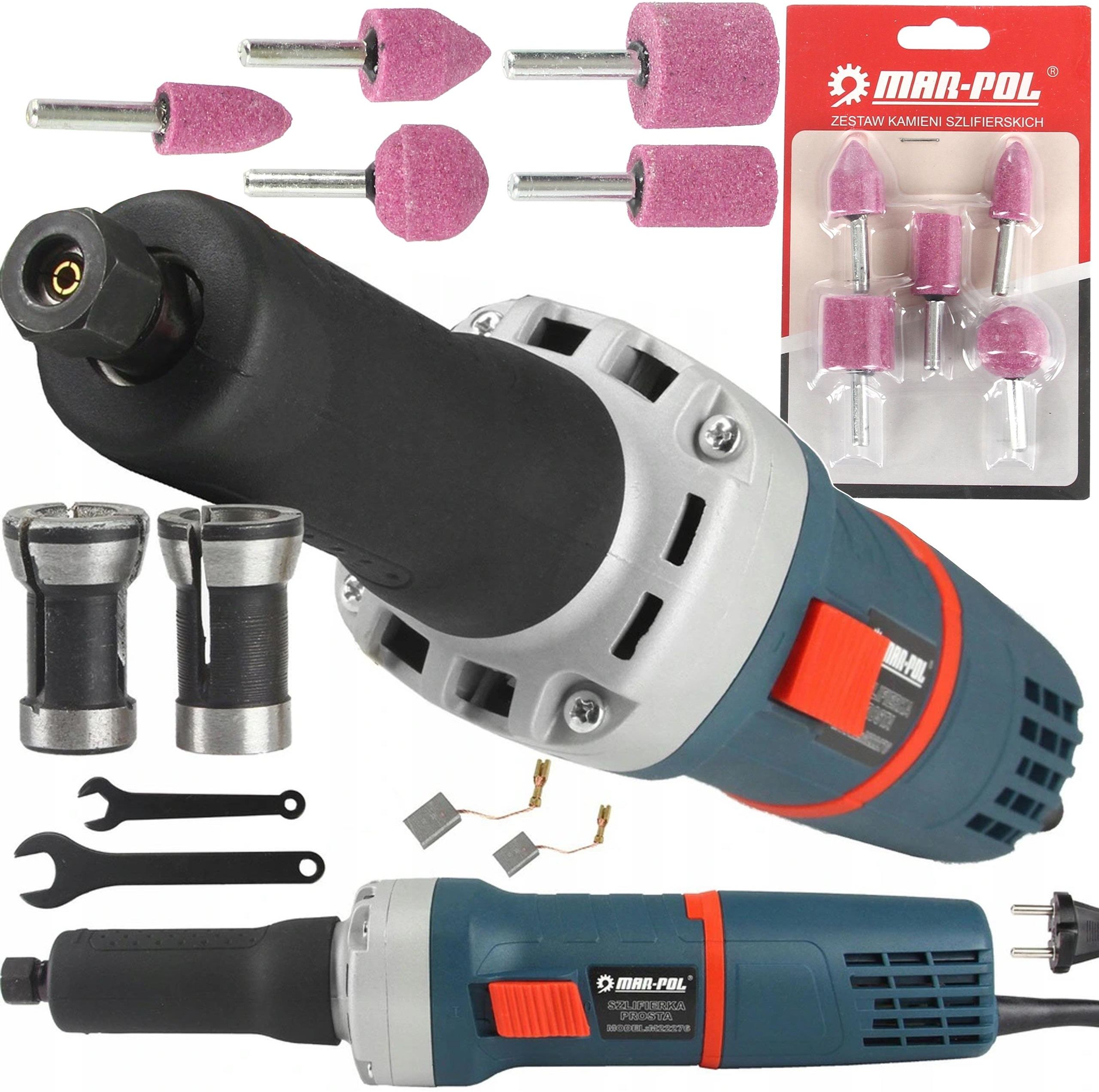 SZLIFIERKA PROSTA wyposażona w elektroniczną REGULACJĘ obrotów + GRATIS Kamienie szlifierskie - 5 szt. Szlifierka prosta znajduje zastosowanie w pracach ślusarskich, stolarskich i wszelkiego rodzaju obróbce materiałów ze szkła, ceramiki i tworzyw sztucznych. Potrzeba oczyszczenia powierzchni z korozji w trudno dostępnych miejscach czy przeszlifowanie ostrych krawędzi nie stanowić już będą żadnego problemu a płynna regulacja obrotów pozwoli na właściwy dobór prędkości obrotowej wrzeciona szlifierki do materiału który chcemy obrabiać. W zestawie znajdują się dwie wymienne tulejki do mocowania akcesoriów w rozmiarze 6 mm i 8 mm. daje to szersze możliwości przy doborze akcesoriów. Dane techniczne Napięcie zasilania: 230 V Częstotliwość zasilania: 50/60 Hz Zakres obrotów : 8000-30000 min-1 Uchwyt narzędziowy Ø : 6 mm Dodatkowy uchwyt narzędziowy Ø : 8 mm Masa: 2,30 kg Dopuszczalna średnica pilnika: 25 mm Kamienie szlifierskie do wiertarki - 5 szt. Dane techniczne: Ilość w zestawie: 5 sztuk Długość trzpienia: 25 mm Grubość trzpienia: 6 mm Opis: Kamienie szlifierskie zestaw pięciu kamieni przystosowanych do prac w warsztatach profesjonalnych oraz amatorskich. Produkt zostały solidnie wykonany co przekłada się na ich wytrzymałość i żywotność. Pięć kamieni w kształcie walca doskonale sprawdzi się do obróbki precyzyjnej większości metali. Szlifierka wyposażona jest w regulację obrotów (1) wrzeciona. Umożliwia to łatwiejszą obróbkę materiału, należy pamiętać iż stosowanie przystawki/frezy muszą być przystosowane do pracy z prędkością od 8000 do 30 000 obr/min. Przebieg obrotów zależnie od wybranego biegu 8.000 - 10.000 11.000 - 13.000 15.000 - 17.000 19.000 - 21.000 24.000 - 26.000 27.000 - 30.000 Mocowanie pilnika we wrzecionie przeprowadź zgonie z prezentowanym rysunku za pomocą dołączonych kluczy: 1. Zablokuj wałek szlifierki 2 Odkręć nakrętkę wrzeciona 3 Umieść pilnik pamiętając o maksymalnym odsunięciu 8mm 4 Dokręć wrzeciono