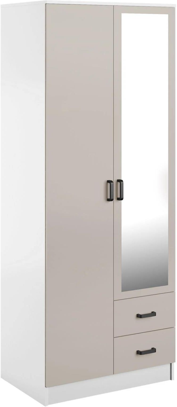 Szafa Cento II 80x200 2D2S biały / kaszmir z lustrem to harmonijne połączenie delikatnych barw i praktycznej formy, które doskonale sprawdzi się w sypialni, garderobie lub przedpokoju. Front w ciepłym odcieniu kaszmiru pięknie kontrastuje z białym korpusem, tworząc spójną i elegancką całość, pasującą zarówno do aranżacji w stylu klasycznym, japandi, skandynawskim, jak i nowoczesnym czy boho. Zintegrowane lustro na jednym ze skrzydeł wizualnie powiększa przestrzeń i zwiększa komfort codziennego użytkowania. Wewnątrz mebla zaprojektowano pięć zamkniętych półek, a na dole znajdują się dwie praktyczne szuflady na prowadnicach rolkowych. Uchwyty z tworzywa sztucznego w czarnym kolorze dodają nowoczesnego akcentu. Szafa została wykonana z płyty laminowanej o grubości 16 mm, wykończonej trwałym obrzeżem PCV. Wymiary mebla to 80 cm szerokości, 205 cm wysokości oraz 52 cm głębokości. Produkt przeznaczony jest do samodzielnego montażu.