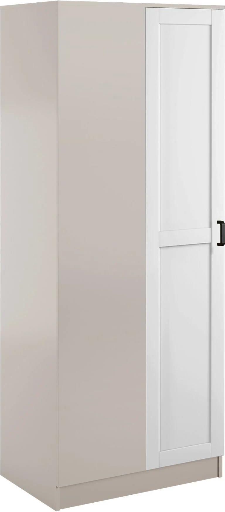 Szafa Cento II narożna 82x200 1D kaszmir/biała ramka to elegancki mebel, który w subtelny sposób wzbogaca aranżację wnętrza o element nowoczesnego designu. Korpus w kolorze kaszmiru pięknie kontrastuje z białym frontem otoczonym dekoracyjną ramką z foliowanego MDF-u, tworząc harmonijne zestawienie barw i faktur. Taka forma świetnie wpisuje się w estetykę stylu japandi, boho, skandynawskiego, klasycznego oraz nowoczesnego, dodając wnętrzom lekkości i uporządkowanego charakteru. Wnętrze szafy kryje jedną zamkniętą półkę, pozwalającą na przechowywanie rzeczy osobistych lub sezonowych tekstyliów. Całość została wykonana z płyty laminowanej o grubości 16 mm i wykończona trwałym obrzeżem PCV, co zapewnia solidność i estetyczny wygląd na lata. Szafa ma szerokość 82 cm, wysokość 205 cm i głębokość 52 cm, co czyni ją doskonałym wyborem do wnętrz, gdzie liczy się każdy centymetr przestrzeni. Uchwyty wykonano z tworzywa sztucznego, a montaż należy przeprowadzić samodzielnie. Produkt objęty jest dwuletnią gwarancją.