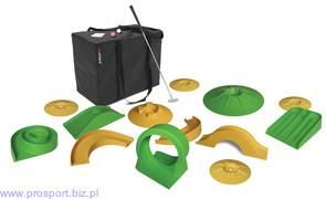 Mini golf Basic - mobilne pole golfowe, doskonała zabawa dla dzieci, dorosłych i całej rodziny. Grasz kiedy chcesz i gdzie chcesz, na każdej nawierzchni, wewnątrz i na zewnątrz, w pogodny ale i deszczowy dzień, niezależnie od pory dnia i roku. Możesz stworzyć własne pole golfowe w ogrodzie, w parku, na boisku, w domu, w lesie, gdziekolwiek sobie zamarzysz. Możesz tworzyć pola golfowe bazujące na pojedynczych przeszkodach, zestawiać je ze sobą, reżyserować przebieg gry tworząc jej następne etapy w kolejnych pokojach. Po prostu ustawiasz elementy zestawu na ziemi i już grasz. Zestaw składa się z 13 przeszkód, umożliwiających stworzenie 9 dołkowego pola golfowego. Przeszkody wykonane są z odpornego na zarysowania i uderzenia trwałego tworzywa ABS. W zestawie znajdziesz: - warm-up – najłatwiejszy dołek /4 szt./, średnica 34 cm - wave – mostek z dołkiem z najwyższym jego punkcie /1 szt./, wymiary 64 x 25 x 13 cm - towers - dołek z przeszkodami /1 szt./, wymiary 45 x 8 cm - maze – pochylnia z labiryntami, w jednym z nich dołek /1 szt./, wymiary 41 x 36 x 13 cm - bridge – przeszkoda w formie mostu /1 szt./, wymiary 67 x 15 x 19 cm - 360 – przeszkoda w formie pętli 360 stopni /1 szt./, wymiary 40 x 33 x 41 cm - acapulco – spiralna wieża zakończona dołkiem /1 szt./, wymiary 42 x 35 x 11 cm - daytona – przeszkoda w formie wyprofilowanego zakrętu /2 szt./, wymiary 65 x 30 x 11 cm - volcano – stożkowy dołek ze stromym podjazdem /1 szt./, wymiary 55 x 8 cm Nieodłącznymi elementami zestawu są: - 1 stalowy 93 cm kij (stal chromowana, aluminiowa główka, skóropodobny uchwyt) - 2 piłki golfowe - bloczek kart do zapisywania wyników (50 arkuszy, dla 6 graczy każdy) - trwała nylonowa torba do przewożenia i przechowywania zestawów. W ofercie posiadamy pojedyncze kije, piłki golfowe, karty wyników czy poszczególne przeszkody, tak więc rozbudowanie zestawu nie stanowi żadnego problemu.