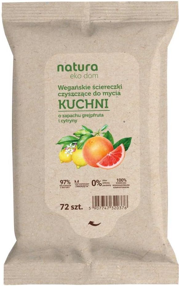Wegańskie ściereczki czyszczące do mycia kuchni to wyjątkowy produkt przeznaczony do utrzymania czystości w kuchni. Wygodne w użyciu dzięki zastosowaniu rozwiązania 2w1, czyli ściereczki nasączonej płynem czyszczącym. , Naturalne i nawilżane ściereczki skutecznie usuwają kuchenne zabrudzenia oraz lepki brud i tłuszcz, pozostawiając powierzchnie czyste i bez smug. Mogą być używaney do czyszczenia zlewozmywaków, blatów kuchennych, kuchenki, glazury, terakoty oraz innych zmywalnych powierzchni. Cytrusowy zapach owoców grejpfruta pozostawia długotrwały aromat świeżości i czystości. , ,
