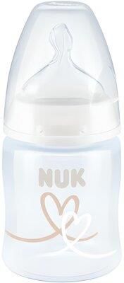 Butelka First Choice z wbudowanym wskaźnikiem temperatury zmienia swój kolor w zależności od temperatury zawartości butelki: jeżeli pokarm jest za gorący, wskaźnik, który zwykle jest niebieski zmienia kolor na biały. Wskaźnik temperatury NUK jest przewidziany jako dodatkowa weryfikacja. Prosimy o sprawdzenie temperatury bezpośrednio przed podaniem pokarmu dziecku. Butelka posiada wyjątkowo miękki smoczek silikonowy dostosowany do kształtu jamy ustnej. Butelka testowana w szpitalach dla optymalnego łączenia karmienia piersią i butelką. Posiada antykolkowy system odpowietrzania który pomaga zapobiegać kolce. Wygodna do napełniania i czyszczenia posiada szeroki otwór butelki. Butelka o pojemności 150 ml 0-6m ze smoczkiem silikonowym w rozmiarze M. Wymiary/waga: wymiary produktu wys. x szer. cm : 14x6, wymiary opakowania wys. x szer.. x gł. cm : 15x7x7, waga produktu bez opakowania kg : 0,06 kg, waga produktu w opakowaniu kg : 0,09 kg. Produkt przeznaczony dla dzieci w wieku: 0-6m . Pakowany w kartonik z okienkiem. Wyprodukowano w Niemczech.