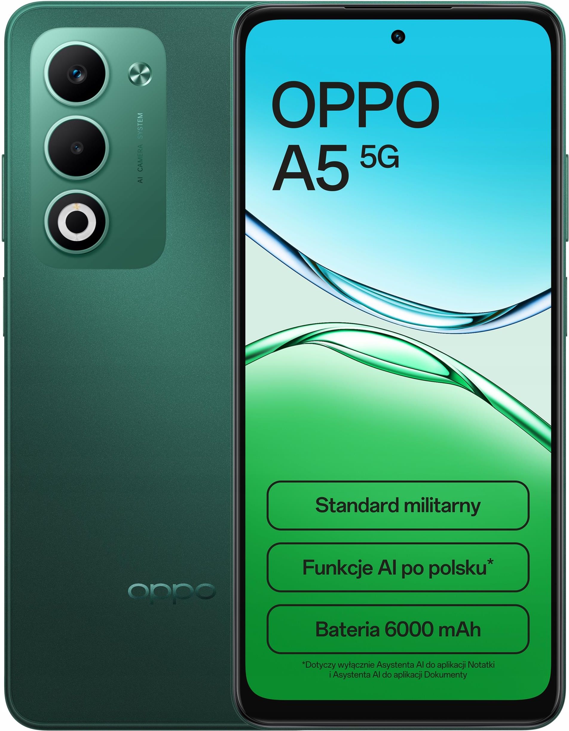 OPPO A5 5G 16,9 cm (6.67") Dual SIM Android 15 4G USB Type-C 4 GB 128 GB 6000 mAh Biały OPPO A5 5G . Długość przekątnej ekranu: 16,9 cm (6.67"), Rozdzielczość: 720 x 1604 px. Typ procesora: MediaTek, Model procesora: Dimensity 6300. Pojemność pamięci RAM: 4 GB, Typ pamięci RAM: LPDDR4X, Pojemność pamięci wewnętrznej: 128 GB. Rozdzielczość głównego aparatu – tył: 50 MP, Typ aparatu tylnego: Podwójny obiektyw. Obsługa kart SIM: Dual SIM. Zainstalowany system operacyjny: Android 15. Pojemność baterii: 6000 mAh. Kolor produktu: Biały. Waga produktu: 194 g Najważniejsze parametry techniczne Konstrukcja - Nazwa koloru: Aurora Green Konstrukcja - Kolor produktu: Biały Konstrukcja - Układ: Klasyczny Konstrukcja - Cechy zabiezpieczeń: Odporny na kurz, Bryzgoszczelny Cechy - Akcelerometr: Tak Cechy - Stopień ochrony IP: IP65 Cechy - Elektryczny kompas: Tak Cechy - Czujnik oświetlenia otoczenia: Tak Moc - Technologia baterii: Litowo-polimerowy (LiPo) Moc - Zasilacz sieciowy: Nie Moc - Bezprzewodowe ładowanie: Nie Moc - Port ładowania USB typu C: Tak Moc - Wymagana moc ładowania (min): 10 W Moc - Wymagana moc ładowania (maks): 45 W Moc - Zasilanie USB: Tak Procesor - Architektura procesora: ARM Cortex-A76+Cortex-A55 Procesor - Typ procesora: MediaTek Procesor - Model procesora: Dimensity 6300 Procesor - Liczba rdzeni procesora: 8 Procesor - Maksymalne taktowanie procesora: 2,4 GHz Nośnik danych - Pojemność pamięci RAM: 4 GB Nośnik danych - Wirtualna pamięć RAM (maks): 6 GB Nośnik danych - Typ pamięci RAM: LPDDR4X Nośnik danych - Pojemność pamięci wewnętrznej: 128 GB Nośnik danych - Obsługiwane typy kart pamięci: MicroSD (TransFlash) Nośnik danych - Maksymalny rozmiar karty pamięci: 1 TB Kamera - Rozdzielczość głównego aparatu – tył: 50 MP Kamera - Rozdzielczość drugiego aparatu – tył: 2 MP Kamera - Liczba przesłon aparatu tylnego: 1,8 Kamera - Liczba przesłon drugiego aparatu tylnego: 2,4 Kamera - Kąt pola widzenia drugiego aparatu tylnego (FOV): 89° Kamera - Elementy obiektywu tylnej kamery: Soczewka 5-elementowa Kamera - Elementy obiektywu drugiej kamery tylnej: 3-elementowy obiektyw Kamera - Elementy obiektywu kamery przedniej: 4-elementowa soczewka Kamera - Typ przedniej kamery: Pojedynczy obiektyw Kamera - Lampa błyskowa z tyłu aparatu: Tak Kamera - Lampa błyskowa z przodu aparatu: Tak Kamera - Maksymalna liczba klatek na sekundę: 120 fps Kamera - Tryby nagrywania wideo: 720p Kamera - Typ aparatu tylnego: Podwójny obiektyw Kamera - Tylna kamera głębi 3D: Tak Kamera - Przedni aparat z głębią 3D: Nie Kamera - Kąt pola widzenia aparatu tylnego (FOV): 76° Kamera - Automatyczne ustawienie ostrości: Tak Kamera - Panoramo: Tak Kamera - Tryb opóźnienia: Tak Kamera - Rozdzielczość kamery przedniej: 8 MP Kamera - Liczba przesłon przedniej kamery: 2 Kamera - Typ stabilizatora obrazu: Electronic Image Stabilization (EIS) Kamera - Kąt widzenia przedniego aparatu (FOV): 80° Kamera - Tryb nocny: Tak Kamera - Tryb pracy portretowej: Tak Kamera - Tryb zwolnionego tempa: Tak Kamera - Szybkość zwolnionego tempa: 720P 120fps Sieć - Obsługa kart SIM: Dual SIM Sieć - Wi-Fi: Tak Sieć - Wersja Bluetooth: 5.4 Sieć - Generacja sieci mobilnej: 4G Sieć - Typ karty SIM: NanoSIM Sieć - Standardy 4G: LTE-TDD & LTE-FDD Sieć - Standardy 3G: WCDMA Sieć - Standard 5G: Nieobsługiwany Sieć - Podstawowy standard Wi-Fi: Wi-Fi 5 (802.11ac) Sieć - Standardy Wi- Fi: 802.11a, 802.11b, Wi-Fi 4 (802.11n), Wi-Fi 5 (802.11ac) Sieć - Bluetooth: Tak Sieć - Profile Bluetooth: AAC, APTX, APTX-HD, LDAC, SBC Sieć - Technologia aptX: Tak Sieć - Pasmo częstotliwości: Quad-band Sieć - Wiązanie (tryb modemu): Tak Sieć - GPS: Tak Sieć - BeiDou: Tak Sieć - GLONASS: Tak Sieć - Galileo: Tak Sieć - System satelitarny Quasi-Zenith (QZSS): Tak Wydajność - Technologia szybkiego ładowania: Power Delivery, SuperVOOC Jakość obrazu - Stabilizator obrazu: Tak Wydajność - Karta graficzna: Mali-G57 MC2 Wydajność - Kontrola sztucznej inteligencji: Tak Wydajność - Rozpoznawanie twarzy: Tak Wydajność - Polecenia głosowe: Tak Wydajność - Wsparcie USB on-the-go: Nie Wyświetlacz - Długość przekątnej ekranu: 16,9 cm (6.67") Wyświetlacz - Kształt ekranu: Płaski Wyświetlacz - Typ ekranu: LCD Wyświetlacz - Jasność: 850 cd/m² Wyświetlacz - Stosunek ekranu do obudowy: 89,9% Wyświetlacz - Gęstość pikseli: 264 ppi Wyświetlacz - Gama kolorów DCI-P3: 88% Wyświetlacz - Głębia kolorów: 8 bit Wyświetlacz - Szybkość reakcji na dotyk: 240 Hz Wyświetlacz - Maksymalna jasność wyświetlacza (Outdoor): 1000 cd/m² Wyświetlacz - Rozdzielczość: 720 x 1604 px Wyświetlacz - Kolory wyświetlacza: 16.7 miliona kolorów Wyświetlacz - Maksymalna częstotliwość odświeżania: 120 Hz Porty i interfejsy - Bluetooth Low Energy (BLE): Tak Porty i interfejsy - Wersja USB: 2.0 Porty i interfejsy - NFC: Tak Porty i interfejsy - Port USB: Tak Porty i interfejsy - Wtyk słuchawek: 3,5 mm Porty i interfejsy - Obsługiwany typ USB: USB Type-C Oprogramowanie - Platforma: Android Oprogramowanie - Widelec systemu operacyjnego: ColorOS 15 Video - Połączenie wideo: Tak Oprogramowanie - Zainstalowany system operacyjny: Android 15 Nawigacja - Lokalizacja pozycji: Tak Bateria - Szybkie ładowanie: Tak Bateria - Pojemność baterii: 6000 mAh Ochrona - Czytnik linii papilarnych: Tak Funkcje telefonu - Głośnik: Tak Funkcje telefonu - Alarm wibracyjny: Tak Czujniki - Czujnik zbliżeniowy: Tak Szczegóły techniczne - Okres gwarancji: 2 lat(a) Waga i rozmiary - Waga produktu: 194 g Waga i rozmiary - Wysokość produktu: 165,7 mm Waga i rozmiary - Szerokość produktu: 76,2 mm Waga i rozmiary - Głębokość produktu: 7,99 mm Zawartość opakowania - Przewody: USB Type-C Zawartość opakowania - Ochraniacz ekranu: Tak Zawartość opakowania - Skrócona instrukcja obsługi: Tak Zawartość opakowania - Karta gwarancyjna: Tak Zawartość opakowania - W