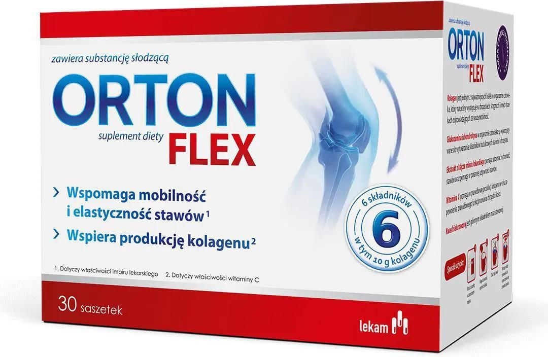 Orton Flex 30 sasz Orton Flex zawiera kompozycję aż 6 składników aktywnych: hydrolizowany kolagen, kwas hialuronowy, glukozamina, chondroityna, ekstrakt z kłącza imbiru lekarskiego i witamina C. Kolagen jest ważnym białkiem w organizmie człowieka, który naturalnie występuje w chrząstkach, ścięgnach i innych tkankach odpowiadających za naszą mobilność. Glukozamina i chondroityna w organizmie człowieka są wykorzystywane do wytwarzania składników budulcowych stawów i chrząstek. Ekstrakt z kłącza imbiru lekarskiego pomaga utrzymać ruchomość stawów oraz pomaga w porannej sztywności stawów. Witamina C pomaga w prawidłowej produkcji kolagenu w celu zapewnienia prawidłowego funkcjonowania chrząstki i kości. Kwas hialuronowy jest składnikiem mazie stawowej. Działanie: Hydrolizowany kolagen jest jednym z najważniejszych białek w organizmie człowieka, które naturalnie występuje w chrząstkach, ścięgnach i innych tkankach odpowiadających za naszą mobilność. Dzięki niemu tkanki są sprężyste, elastyczne i wytrzymałe. Glukozamina i chondroityna w organizmie człowieka są wykorzystywane do wytwarzania składników budulcowych stawów i chrząstek. Ekstrakt z kłącza imbiru lekarskiego pomaga utrzymać ruchomość stawów oraz pomaga w porannej sztywności stawów. Witamina C pomaga w prawidłowej produkcji kolagenu w celu zapewnienia prawidłowego funkcjonowania chrząstki i kości. Kwas hialuronowy jest głównym składnikiem mazi stawowej. Składniki: Hydrolizowany kolagen (Hydrolizat żelatyny pochodzenia wieprzowego), Siarczan glukozaminy 2KCL (ze skorupiaków), regulator kwasowości - Kwas cytrynowy, Aromat czarna porzeczka, Ekstrakt z kłącza imbiru lekarskiego (Zingiber officinale Rosc.), Sól sodowa siarczanu chondroityny (z ryb - rekina), Kwas L-askorbinowy (Witamina C), Kwas hialuronowy, Koncentrat soku z buraka ćwikłowego, Ekstrakt z czerwonej papryki, substancja słodząca - Glikozydy stewiolowe.   Przyjmowanie: 1 saszetka dziennie, najlepiej rano. Zawartość saszetki należy rozpuścić w szklance ciepłej wody, dokładnie wymieszać i wypić. Nie należy przekraczać zalecanej porcji do spożycia w ciągu dnia. ***Suplementy diety nie mogą być stosowane jako substytut (zamiennik) zróżnicowanej diety. Prowadzenie zdrowego trybu życia i stosowanie zrównoważonej diety są niezbędne dla zachowania dobrego stanu zdrowia. Nie należy przekraczać zalecanej porcji do spożycia w ciągu dnia.
