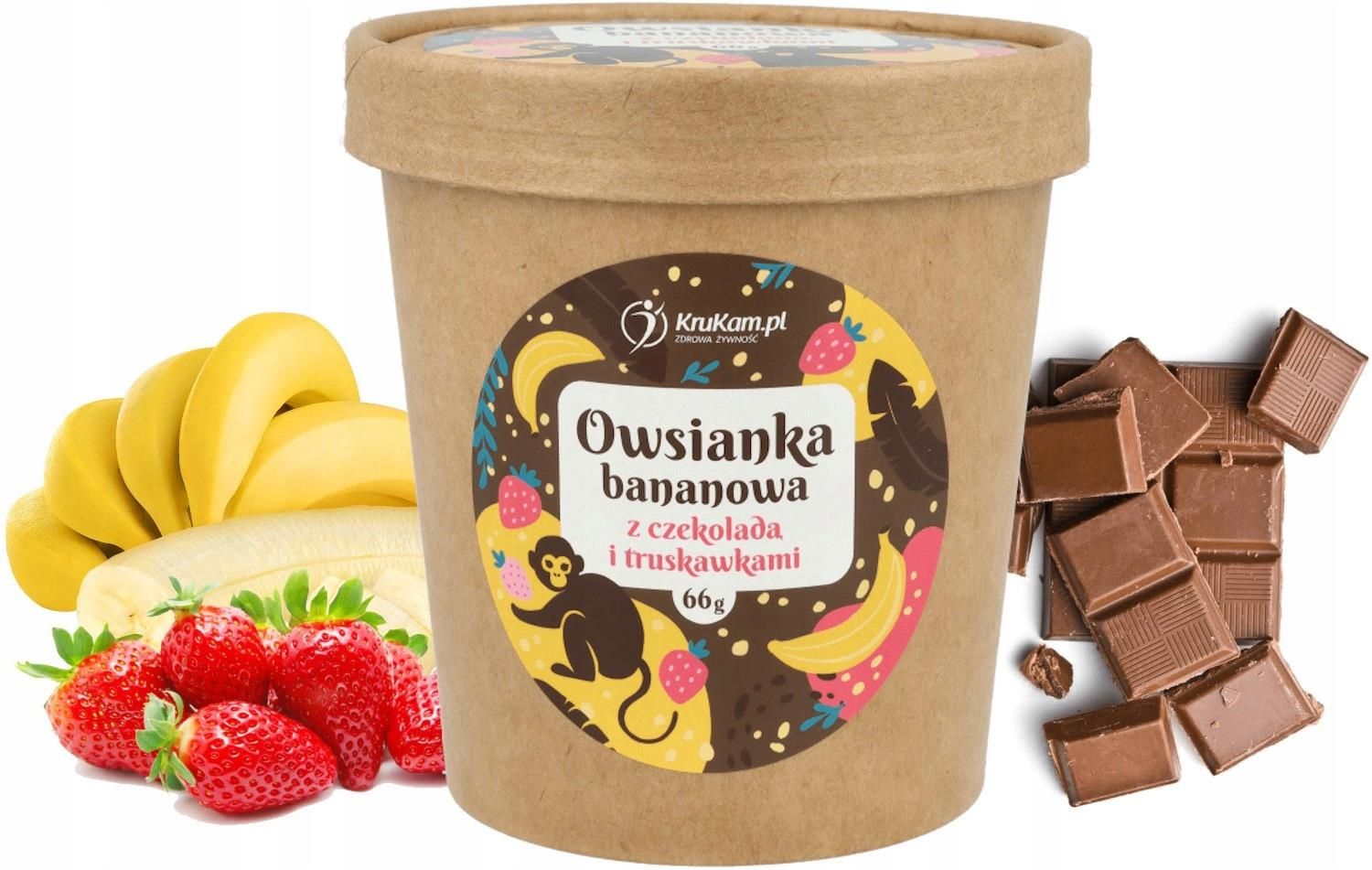 KruKam Owsianka bananowa z czekoladą i truskawkami 66g Składniki płatki owsiane błyskawiczne 45,5%, migdały, ksylitol, banan liofilizowany 10,6%, czekolada 6% (miazga kakaowa, substancja słodząca: erytrytol, tłuszcz kakaowy), truskawka liofilizowana w plastrach 6%, siemię lniane, pszenica …