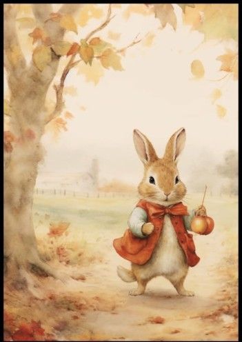 Plakat dziecięcy z królikiem na wiejskiej ścieżce to wyjątkowa dekoracja, która wprowadzi do pokoju Twojego malucha radosną atmosferę natury i jesieni. Uroczy królik w czerwonej kamizelce spacerujący obok drzewa gubiącego liście to piękny obrazek, który z pewnością przyciągnie uwagę każdego …