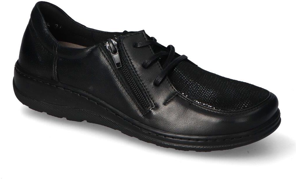 Wyjątkowe półbuty renomowanej marki Kosela: - cholewka wykonana została ze skóry naturalnej licowej i materiału tekstylnego - wnętrze pokryte zostało materiałem tekstylnym aby zapewnić komfort podczas użytkowania - wkładka wewnętrzna wykonana została z materiału tekstylnego - zamek błyskawiczny i sznurowanie ułatwiają zakładanie i dopasowanie obuwia - podeszwa o grubości 3,5 cm zapewnia odpowiednią stabilizację - klasyczna czerń i modny fason tworzą niesamowity efekt!