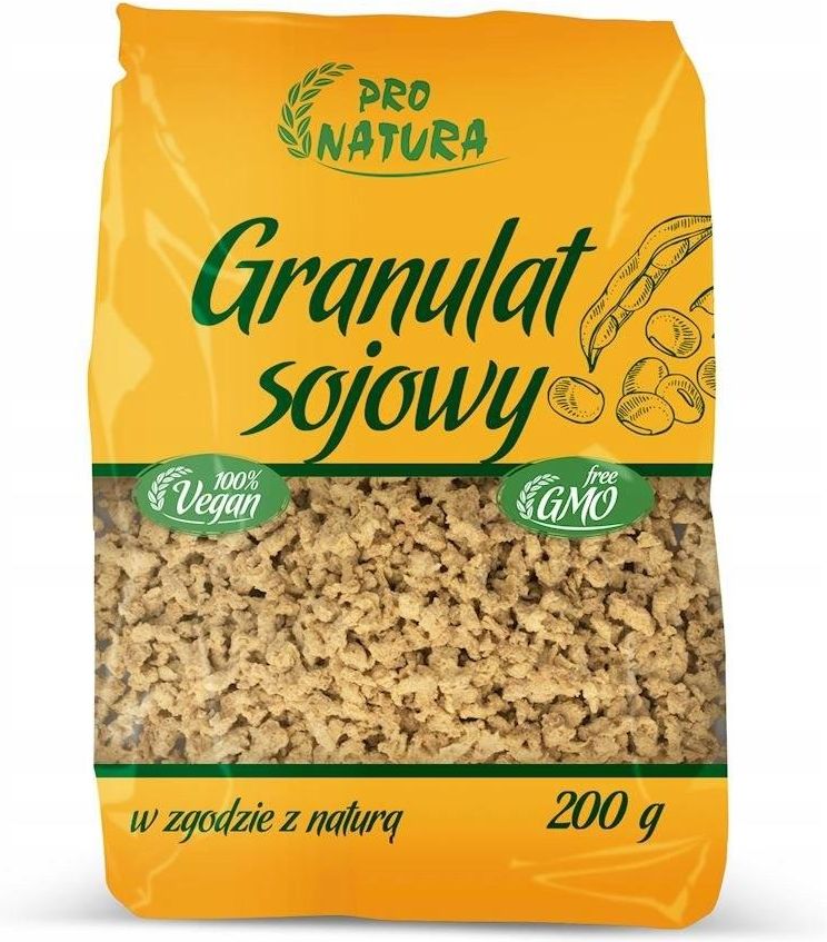 Granulat sojowy - najlepszy zamiennik mięsa! Granulat sojowy 200 g Pro Natura to doskonała, roślinna alternatywa dla mięsa mielonego, idealna do codziennych dań. Powstaje z odtłuszczonej mąki sojowej, która po wytłoczeniu oleju jest poddawana procesowi ekstruzji, a następnie suszona. Dzięki temu produkt jest lekki, odżywczy i w 100% wegański. Do czego używać granulat sojowy? kotletów i burgerów, spaghetti, zapiekanek i lasagne, farszu do pierogów, papryk i naleśników, dań kuchni meksykańskiej, włoskiej czy azjatyckiej. Produkt jest neutralny w smaku, dzięki czemu doskonale wchłania przyprawy i aromaty potraw. Możesz wykorzystać go zarówno do dań wytrawnych, jak i pikantnych, tworząc przepisy dopasowane do własnych upodobań. Jak przygotować granulat sojowy? Zalej granulat wrzątkiem lub gorącym bulionem i odstaw na 10–15 minut. Odsącz nadmiar wody. Podsmaż, duś lub piecz – tak jak mięso mielone. To proste, szybkie i zdrowe rozwiązanie dla każdego, kto chce ograniczyć mięso w diecie, a jednocześnie nie rezygnować z ulubionych potraw. Dodatkowe informacje opakowanie: 200 g Składniki: mąka sojowa odtłuszczona Może zawierać orzechy ziemne, inne orzechy, gluten i sezam. Wartość odżywcza w 100 g Wartość energetyczna 1334 kJ/ 316 kcal Tłuszcz 0,9 g w tym kwasy tłuszczowe nasycone 0,1 g Węglowodany 19 g w tym cukry 0,1 g Błonnik 16 g Białko 50 g Sól 0 g