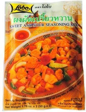 Sos Słodko Kwaśny w Proszku Lobo 100g - przyprawa w proszku do przygotowania sosu słodko kwaśnego. Skład: cukier, skrobia kukurydziana, ocet w proszku, pomidory w proszku, hydrolizowane białko roślinne (soja, kukurydza, maltodekstryna), wzmacniacz smaku: E621, regulator kwasowości: E330, przyprawy (cynamon, chili, biały pieprz, goździki), sól, środek przeciwzbrylający: E551, E341, przyprawy.Przepis Na Wieprzowinę w Sosie Słodko Kwaśnym: w woku rozgrzej 2 łyżki oleju, dodaj 500g wieprzowiny, dodaj łyżkę sosu sojowego i smaż cały czas mieszając do momentu, aż mięso będzie gotowe. Dodaj 60ml wody i pozostaw na 20 minut żeby się gotowało. Rozpuść zawartość saszetki w 180ml wody i dodaj do woka. Następnie dodaj również pokrojone 2 marchewki, cebulę oraz paprykę. Całość gotuj na małym ogniu, na koniec dorzuć odsączonego z soku ananasa. Pozostaw jeszcze na 5 minut, po czym można podawać z ryżem.