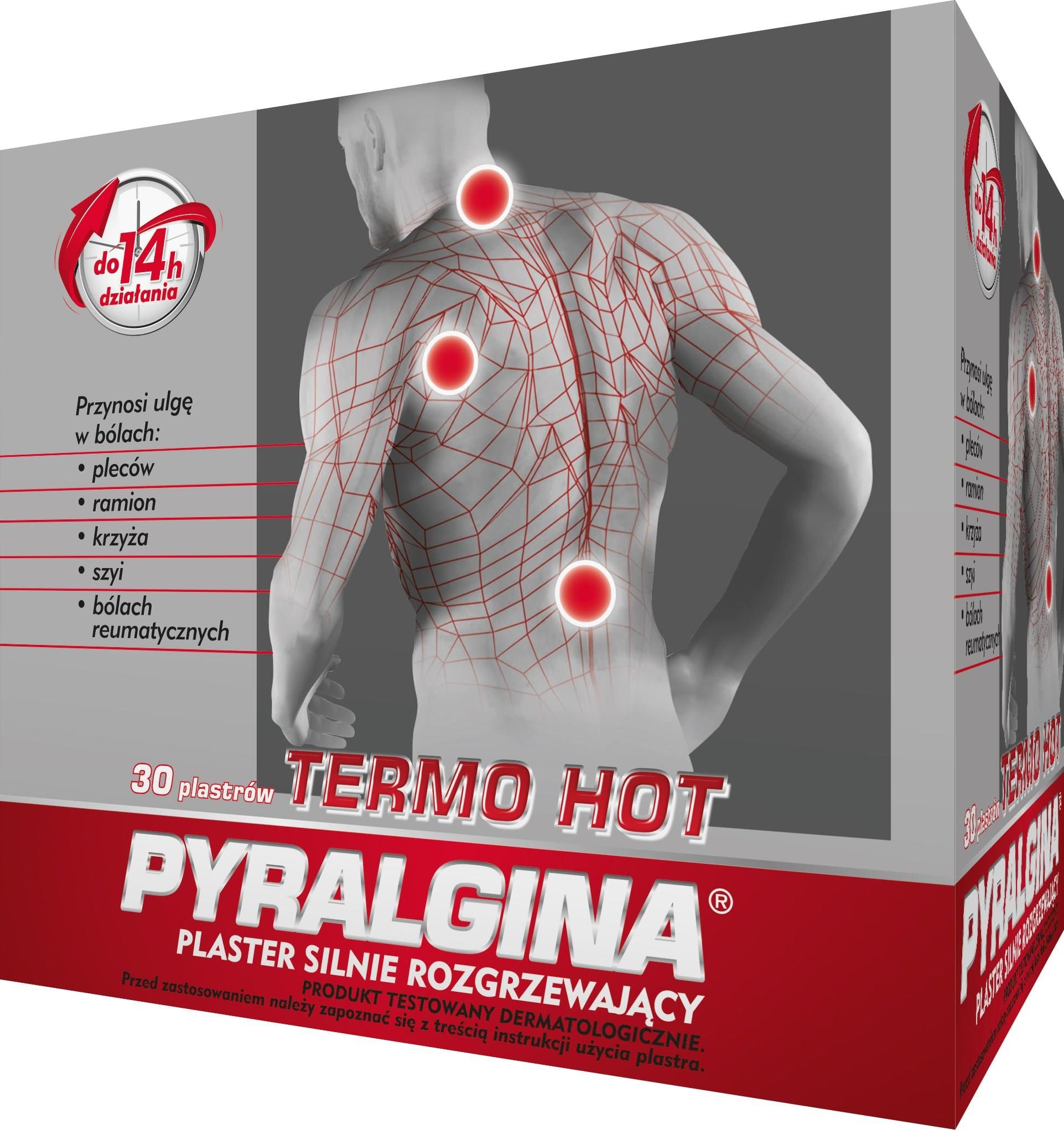 Pyralgina Termo Hot plaster silnie rozgrzewający 1 szt. PYRALGINA ® TERMO HOT Postać: Plaster silnie rozgrzewający Opis produktu / przeznaczenie: Przynosi ulgę w bólach: pleców, ramion, krzyża, szyi, bólach reumatycznych. Do 14 h działania Wskazania: PYRALGINA ® TERMO HOT jest plastrem …