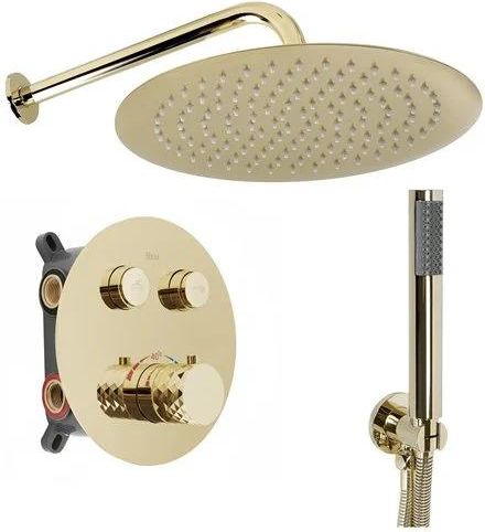 ZESTAW PODTYNKOWY PRYSZNICOWY ZŁOTY TERMOSTAT REA LUNGO DIAMOND GOLD + BOX Zestaw Natryskowy Podtynkowy Rea Lungo Diamond Złoty BOX z Termostatem Rea Lungo Diamond Złoty to nowoczesny zestaw prysznicowy stworzony z myślą o użytkownikach, którzy oczekują niezawodności i eleganckiego wyglądu. Ciepły odcień złota, połączony z subtelnym szczotkowaniem oraz diamentowym ryflowaniem detali, nadaje łazience prestiżowy, luksusowy charakter. Zestaw wykonano z mosiądzu i tworzywa ABS, co zapewnia trwałość, odporność na wilgoć i bezawaryjne użytkowanie przez wiele lat. Wbudowany termostat utrzymuje stałą temperaturę wody, a technologia Anti-Calc chroni elementy natrysku przed osadzaniem się kamienia. Całość oparta jest na inteligentnym systemie montażowym BOX, który łączy estetykę, bezpieczeństwo i wygodę obsługi. Najważniejsze korzyści Nowoczesny system podtynkowy BOX – nowoczesny system BOX pozwala na estetyczny montaż podtynkowy z ukryciem elementów technicznych. To rozwiązanie, które gwarantuje bezpieczeństwo i wygodę na lata. Termostat z funkcją regulacji ciśnienia – gwarantuje bezpieczeństwo, stabilność temperatury i maksymalny komfort kąpieli. Powłoka w kolorze złotym – nadaje wnętrzu elegancji i stylu, doskonale komponując się z innymi elementami serii Lungo Diamond. System Anti-Calc – zapobiega odkładaniu się kamienia w deszczownicy i słuchawce, ułatwiając czyszczenie i wydłużając żywotność zestawu. Deszczownica o szerokim strumieniu – zapewnia równomierny, relaksujący przepływ wody. Trwałe materiały: mosiądz i ABS – gwarantują odporność na korozję i długą niezawodność użytkowania. Specyfikacja techniczna Producent: Rea – Łazienka z wyobraźnią Typ produktu: Zestaw natryskowy podtynkowy z termostatem Seria: Lungo Diamond Kolor: Złoty Wykończenie: Szczotkowane Materiał: Mosiądz / ABS Sposób montażu: Podtynkowy (system BOX) Rodzaj baterii: Termostatyczna Regulacja ciśnienia: Tak System dysz: Anti-Calc Wylewka wannowa: Nie