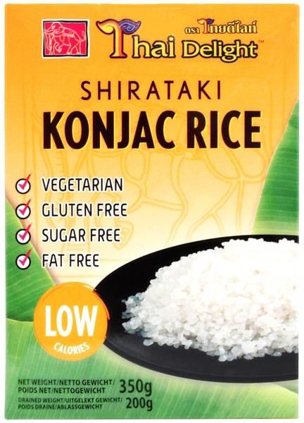 Ryż Shirataki Konjac 350g - Thai Delight Makaron Shirataki Konjac - najbardziej dietetyczny makaron na świecie - w postaci małych ziarenek. Doskonały zamiennik dla tradycyjnego, białego ryżu o niskiej zawartości kalorii i węglowodanów. Produkt naturalnie bezglutenowy i bezcukrowy, bezpieczny dla osób cierpiących na celiakię, nadwrażliwości pokarmowe czy insulinooporność. Mięsiste kuleczki o charakterystycznie półprzejrzystej barwie oraz sprężystej konsystencji to niezwykły dodatek do dań gotowanych i smażonych oraz sałatek. Doskonale wchłaniają smaki towarzyszących im sosów i przypraw, tworząc harmonijne połączenie z twoimi ulubionymi składnikami. Polecamy w szczególności przygotowywane na patelni. Glukomannan konjac to rozpuszczalny w wodzie polisacharyd, pochodzący z bulwy dziwidła Riviera, potocznie znanego jako konjac lub konnyaku. To wyjątkowa roślina pochodząca z górskiej prowincji Junnan w Chinach, która dzięki swoim właściwościom zdobyła popularność w całej Azji Wschodniej. Na dzień dzisiejszy jej największymi konsumentami są Japończycy, którzy używają konjac do wyrobu makaronów i galaretek. Ich charakterystyczna konsystencja, obojętny smak sprawiają, że produkty konnyaku mogą być używane jako podstawa lub dodatek zarówno do dań na słono, jak i na słodko; na ciepło i na zimno. Makarony shirataki spożywane są jako niskokaloryczny zamiennik ryżu i tradycyjnego makaronu. Mogą być włączone do niemal każdej potrawy. Makaron shirataki to naturalny produkt, bogaty w rozpuszczalny w wodzie błonnik - bez tłuszczu, cukru, białka, bez pszenicy i glutenu. Ryż shirataki jest półprzezroczysty i pozbawiony swoistego smaku. Łatwo wchłania aromat towarzyszących dodatków i przypraw, jest szybki i wygodny w przyrządzeniu. Wystarczy przepłukać go pod bieżącą wodą, a następnie przełożyć na patelnię i podsmażać bez dodatku tłuszczu do odparowania. Podawaj z ulubionymi dodatkami, aby otrzymać smaczny i zdrowy posiłek, który nie tuczy. :) Przechowywać w suchym miejscu i chłodnym miejscu. Po otwarciu przechowywać w lodówce. Kraj pochodzenia: Tajlandia Skład: Woda, konjac w proszku (Amorphopallus) 3,5%, regulator kwasowości: wodorotlenek wapnia (E526) Wartości odżywcze (w 100g/100ml) Wartość energetyczna: 38kJ/9kcal Tłuszcze: 0g *w tym kwasy tłuszczowe nasycone: 0g Węglowodany: 0,6g *w tym cukry: 0g *w tym błonnik: 3,6g Białko: 0g Sól: 0g
