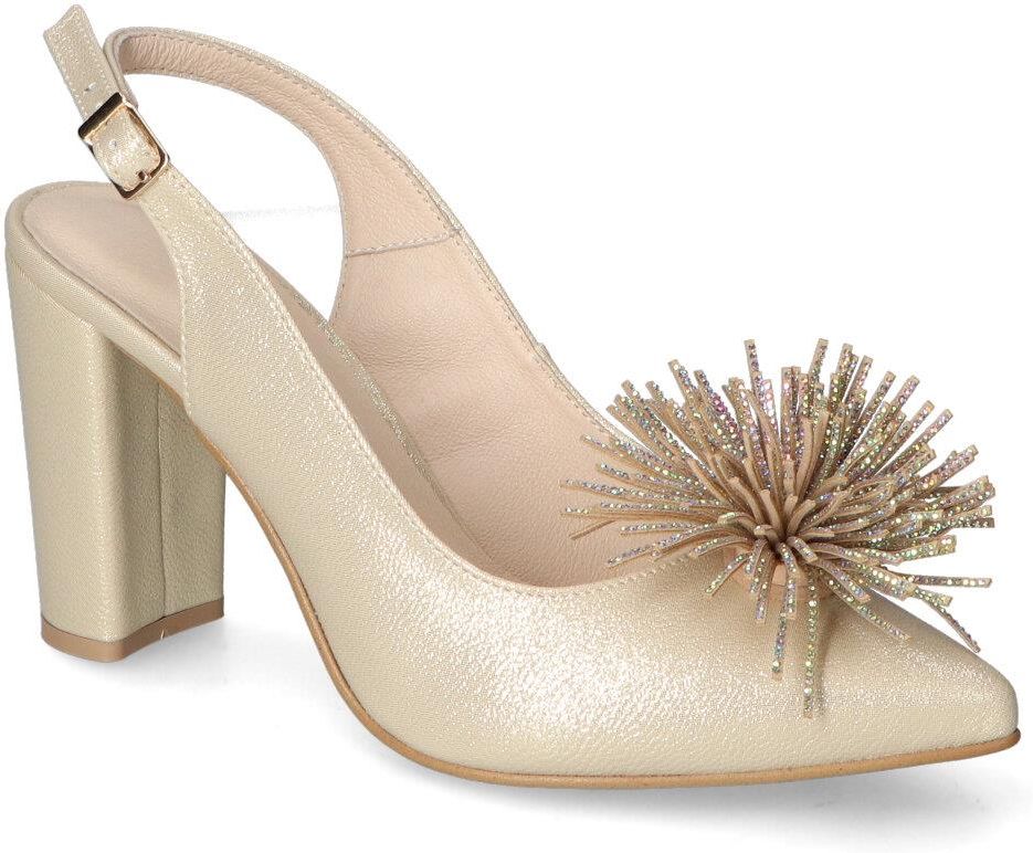 Eleganckie sandały damskie renomowanej marki Boccato: - wykonane zostały z najlepszej jakości ekozamszu - wnętrze pokryte jest skórą naturalną, co zapewnia wygodę i niezwykłą miękkość - wkładka wewnętrzna została wykonana ze skóry naturalnej, co sprawia, że buty są nie tylko wygodne, ale również przyjazne dla skóry - sprzączka ułatwia szybkie i wygodne zakładanie, co jest szczególnie istotne w przypadku butów z obcasem - obcas o wys. 10 cm pozwala na lekkie podniesie pięty, co wpływa na pozytywny wpływ na postawę ciała i dodaje elegancji całej stylizacji - złoty kolor, piękna ozdoba i modny fason zachwycą każdego!