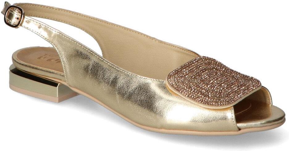 Sandały For-but to idealne połączenie stylu i wygody, które z pewnością przyciągnie uwagę. Wykonane ze skóry ekologicznej, te eleganckie sandały wyróżniają się wyjątkowym złotym wykończeniem oraz efektownym zdobieniem z kryształków, które dodaje im blasku. Doskonałe na letnie wyjścia, wesela czy spotkania ze znajomymi, stanowią uniwersalny dodatek do każdej stylizacji.Otwarty przód sandałów odkrywa palce, a regulowane zapięcie na pięcie zapewnia doskonałe dopasowanie i stabilność. Niski obcas nie tylko dodaje elegancji, ale również zapewnia komfort przez cały dzień noszenia. Wnętrze sandałów wykończone jest miękkim materiałem, co znacznie zwiększa komfort użytkowania.Sandały For-but doskonale komponują się z letnimi sukienkami, spódnicami oraz eleganckimi spodniami, co czyni je wszechstronnym elementem każdej garderoby. Wybierając ten model, inwestujesz w jakość i styl, które podkreślą Twoją indywidualność. Ciesz się modnym wyglądem i komfortem dzięki sandałom For-but, które uczynią każdy krok przyjemnością.