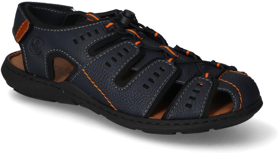 dały męskie Rieker to idealny wybór dla aktywnych mężczyzn, którzy poszukują wygody i stylu. Wykonane z wysokiej jakości skóry ekologicznej oraz materiału, te sandały wyróżniają się trwałością i nowoczesnym designem. Ciemnoniebieski kolor z kontrastującymi pomarańczowymi detalami sprawia, że są nie tylko praktyczne, ale również atrakcyjne wizualnie.Model Rieker charakteryzuje się skórzaną wkładką, która zapewnia maksymalny komfort nawet podczas długotrwałego użytkowania. Dzięki innowacyjnemu systemowi sznurowania, sandały idealnie dopasowują się do stopy, co zwiększa stabilność i wygodę na każdym kroku. Otwory wentylacyjne w cholewce pozwalają na swobodny przepływ powietrza, co jest niezwykle ważne w upalne dni.Sandały męskie Rieker to must-have w letniej garderobie każdego mężczyzny. Wybierz je, aby cieszyć się komfortem i stylem podczas letnich przygód, spacerów czy relaksu na plaży.
