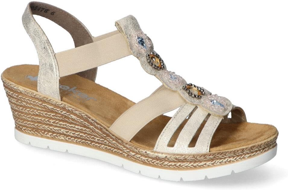 Wyjątkowe sandały firmy Rieker: - wykonane z wysokiej jakości skóry ekologicznej - wkładka wewnętrzna wykonana z materiału tekstylnego - wnętrze pokryte zostało skóra ekologiczną aby zapewnić komfort podczas użytkowania - koturn o wysokości 6 cm zapewnia odpowiednią stabilizację - beżowy kolor i modny fason tworzą zachwycający efekt!